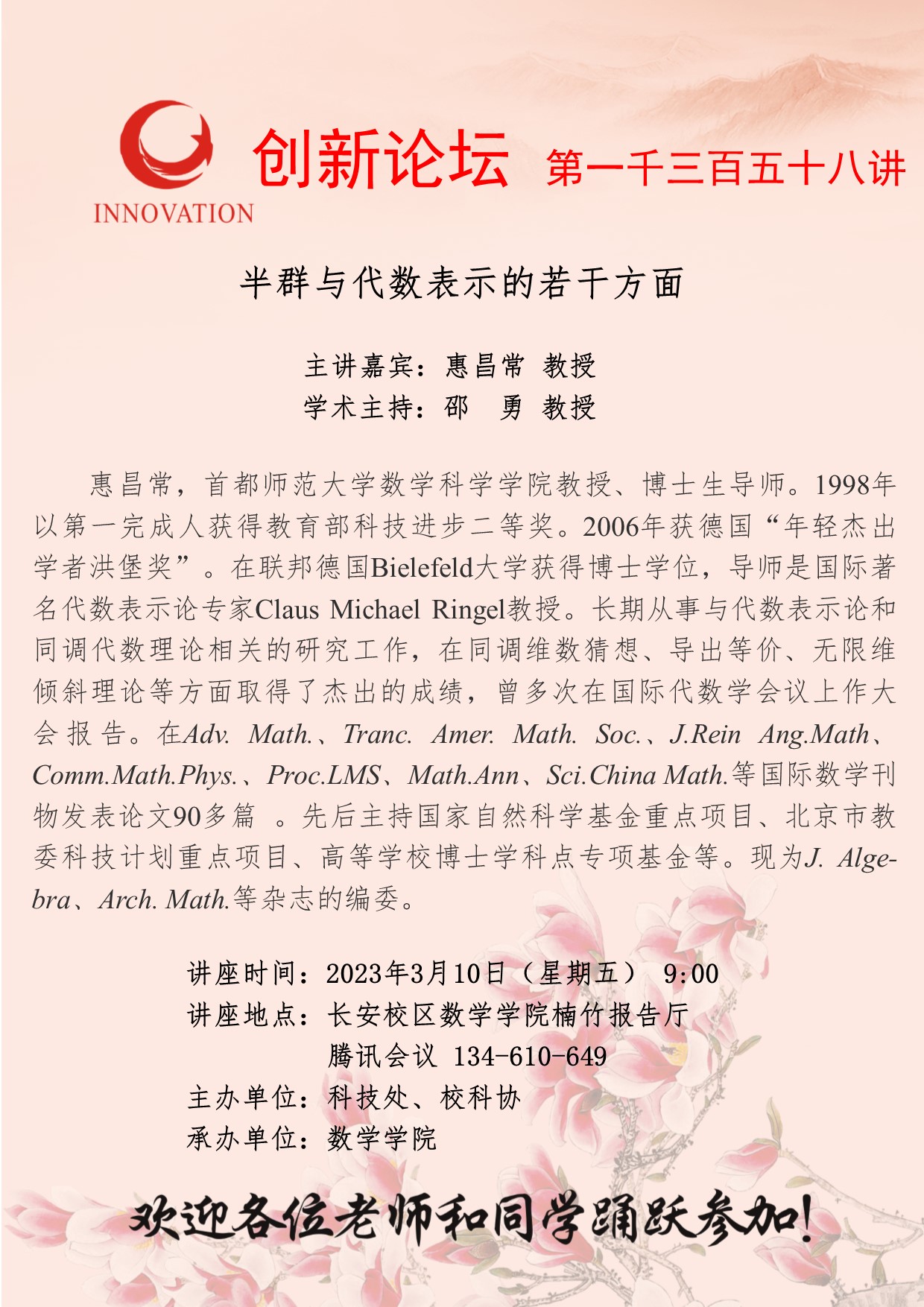 乐鱼web版登录入口创新论坛第一千三百五十八讲:半群与代数表示的若干方面