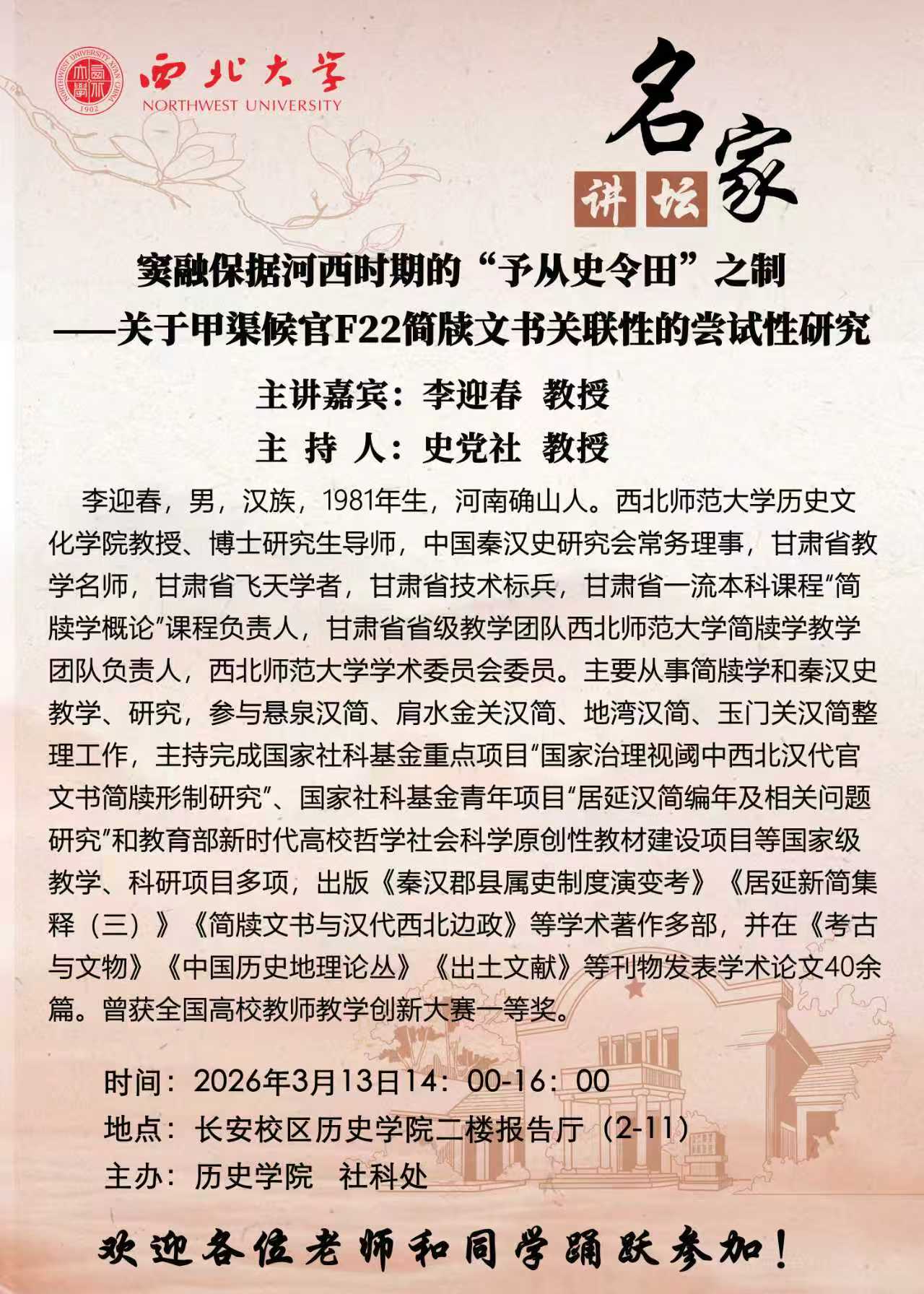 名家讲坛:窦融保据河西时期的“予从史令田”之制——关于甲渠候官F22简牍文书关联性的尝试性研究