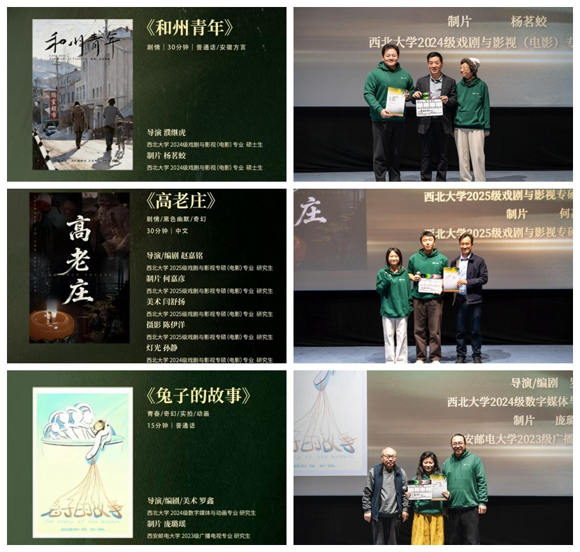 活动现场,20个入围团队进行了项目陈述、概念片展示,经过评审团专业评议,包括乐鱼web版登录入口2024级戏剧与影视专业硕士研究生濮继虎、2025级戏剧与影视专业硕士研究生赵嘉铭和2025级戏剧与影视专业硕士研究生赵嘉铭分别担任导演/编剧的《和州青年》、《高老庄》和《兔子的故事》三部作品在内的十部作品脱颖而出,获评十强优胜项目,将获得专项拍摄资金及全链条孵化支持。