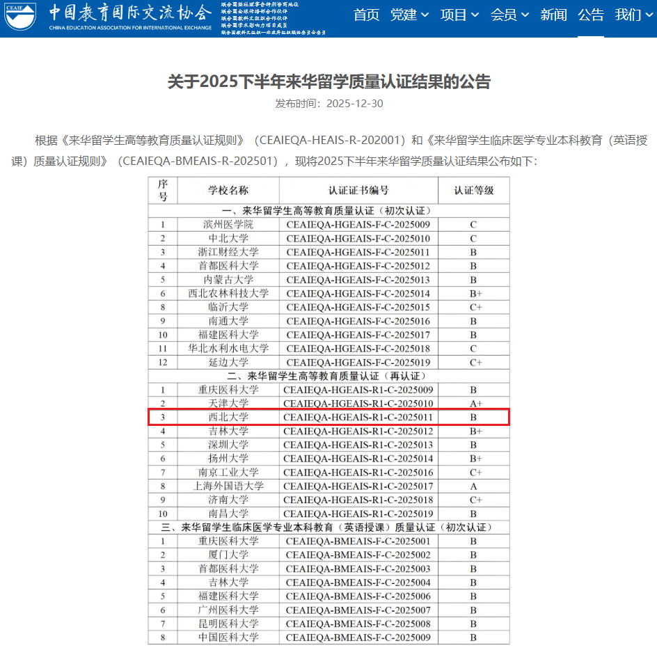 日前,中国教育国际交流协会发布关于2025下半年来华留学质量认证结果的公告。乐鱼web版登录入口顺利通过来华留学生高等教育质量再认证,获得“B级”认证,认证有效期为6年,在参加质量再认证的陕西高校中位列前三。