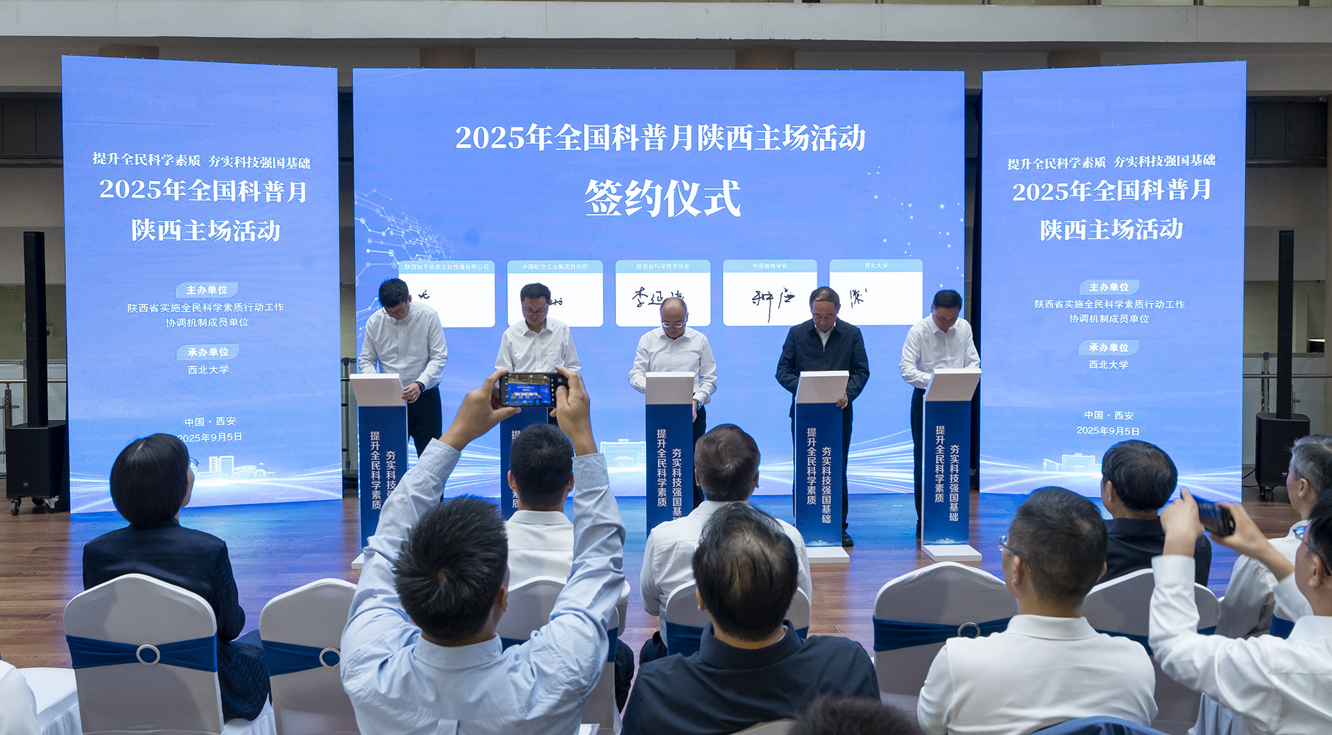 李延潮与种康院士、陈富林、蒲优华、陕西知乎总经理龚继武分别代表各方签署了《科普协同发展协议》,搭建优质科普交流平台,共同推动科普事业高质量发展。