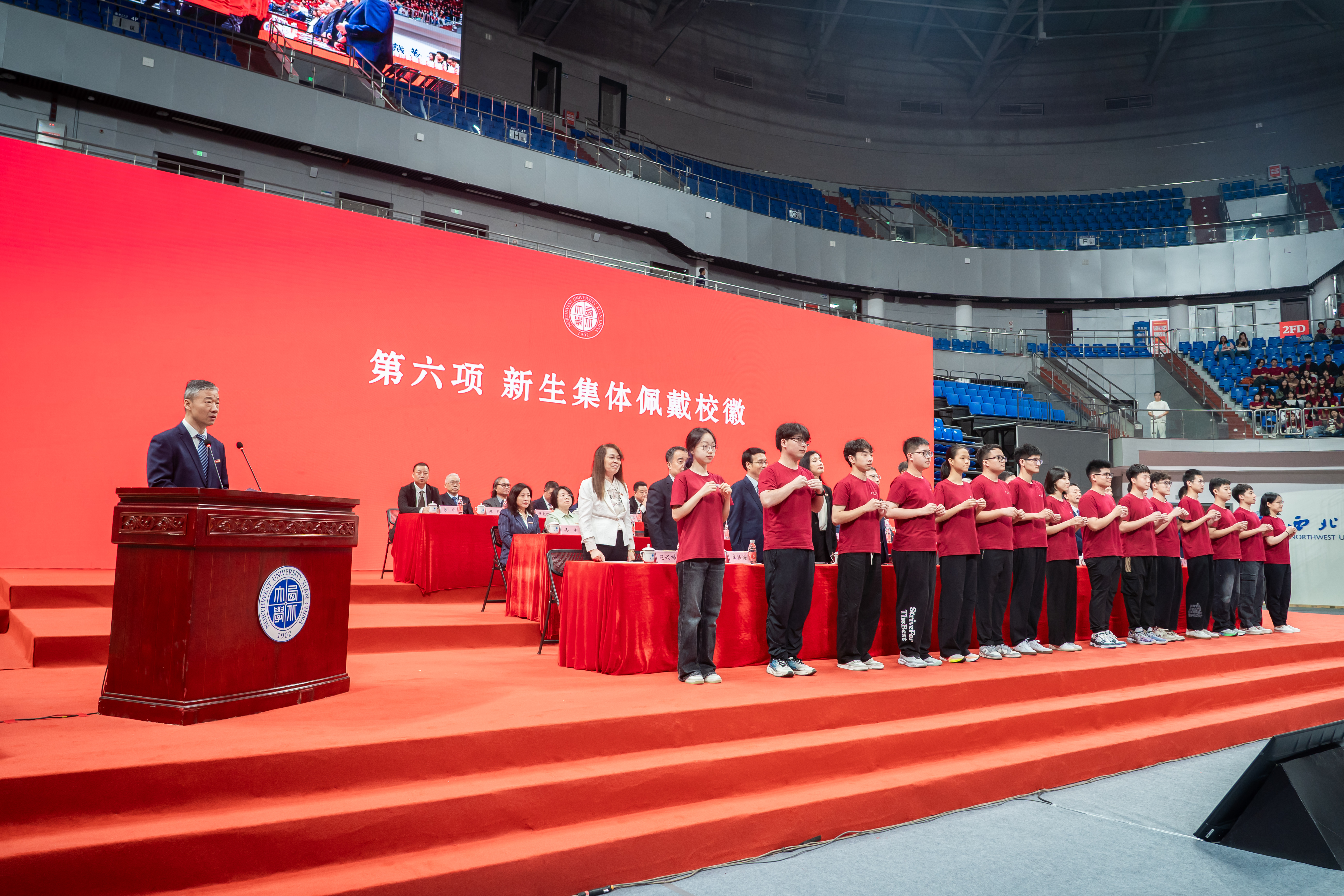 随后,主席台前排领导为新生代表颁发校徽,全体同学将“乐鱼web版登录入口校徽”庄重佩戴在胸前。校徽承载着西大人的初心和使命,饱含着老师们的祝福与期望。今天正式佩戴校徽后,同学们便与西大血脉相连,“公诚勤朴”的校训精神也将在新一届学子中传承发扬,汇聚成强国有我、奋进新征程的精神伟力。