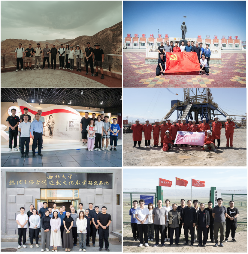 本次“访企拓岗”期间,张志飞还带领师生实践队伍开展了系列实践教学活动。在丹霞地貌与典型剖面地带,队员们深入岩层,进行地质调查与认知实习;在三塘湖盆地,实践队伍重温了乐鱼web版登录入口1953级杰出校友杨拯陆烈士的感人事迹,在其铜像前庄重拜谒,并以现场教学、集体纪念等形式,深刻引导青年学生厚植爱国主义情怀、强化使命担当。随后,实践队还对吐哈油田采油作业现场进行了实地考察,深入了解我国西部油气田的发展历程、勘探技术及数字化运维情况,提升了学生对能源勘探全过程的感性认知与系统理解。此外,在巴里坤县和伊吾县,实践队还与乐鱼web版登录入口东天山考古队开展了2场实地交流,促进了地质与考古学科之间的交叉融合,拓宽了学生的学术视野。