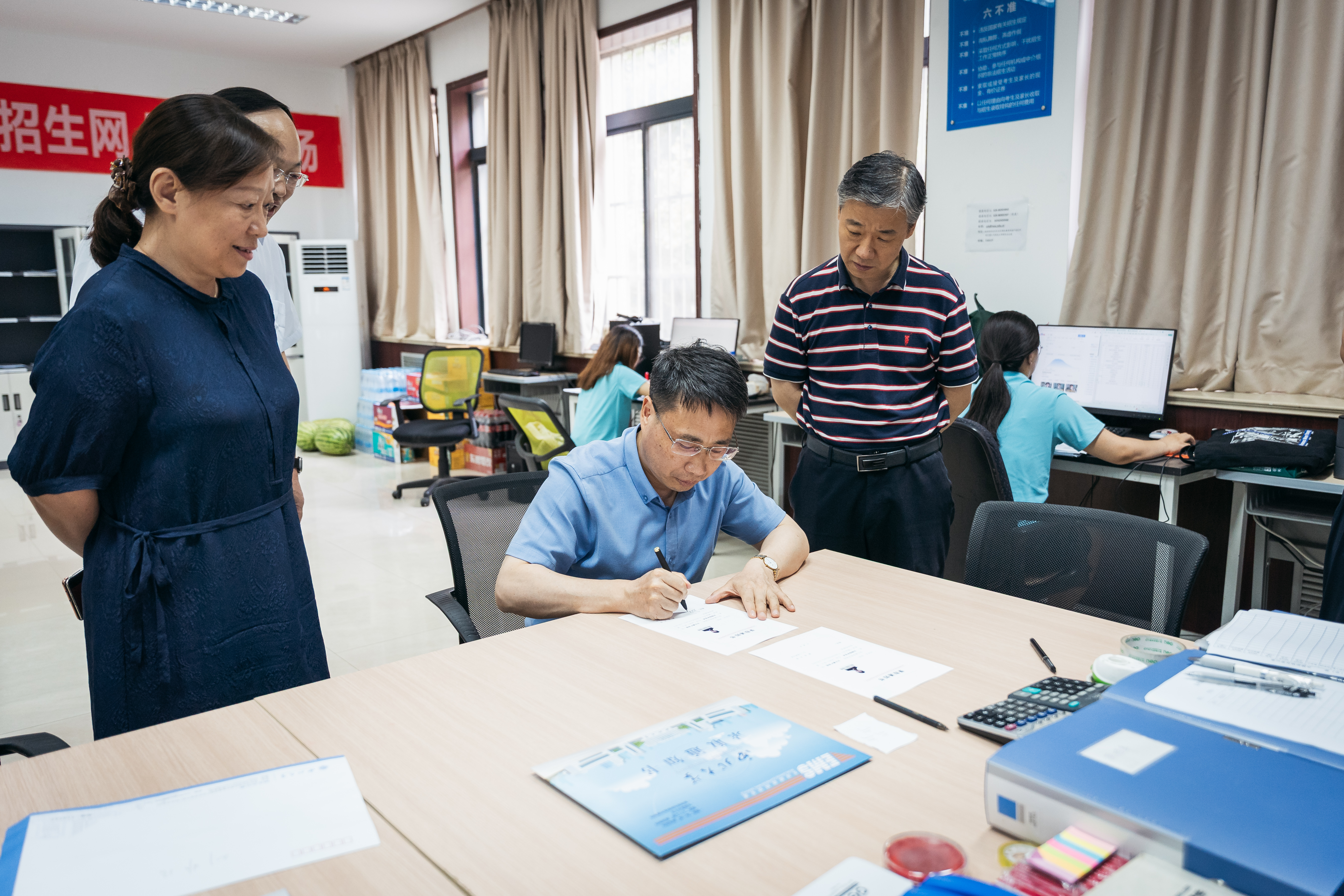 调研期间,校领导还详细询问了本科招生录取流程、录取通知书印制封装等工作的开展细节,招生工作相关负责人进行了现场演示。孙庆伟还为新生代表亲笔签写录取通知书,传递学校对新生的殷切期盼。