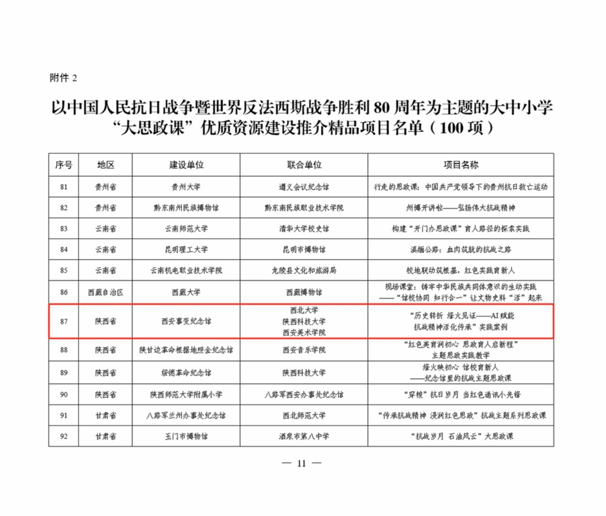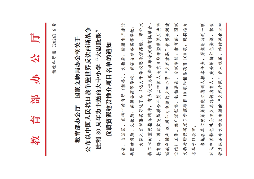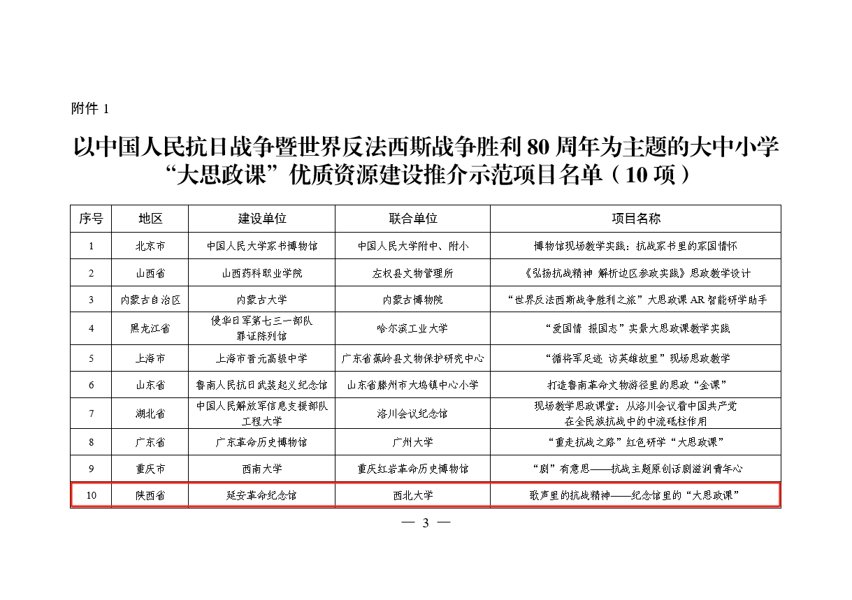 日前,教育部办公厅、国家文物局办公室公布了以中国人民抗日战争暨世界反法西斯战争胜利80周年为主题的大中小学“大思政课”优质资源建设推介项目名单。延安革命纪念馆联合乐鱼web版登录入口申报的“歌声里的抗战精神——纪念馆里的‘大思政课’”入选示范项目(共10项),西安事变纪念馆联合乐鱼web版登录入口等高校申报的“历史转折 烽火见证——AI赋能抗战精神活化传承”实践案例入选精品项目(共100项)。
