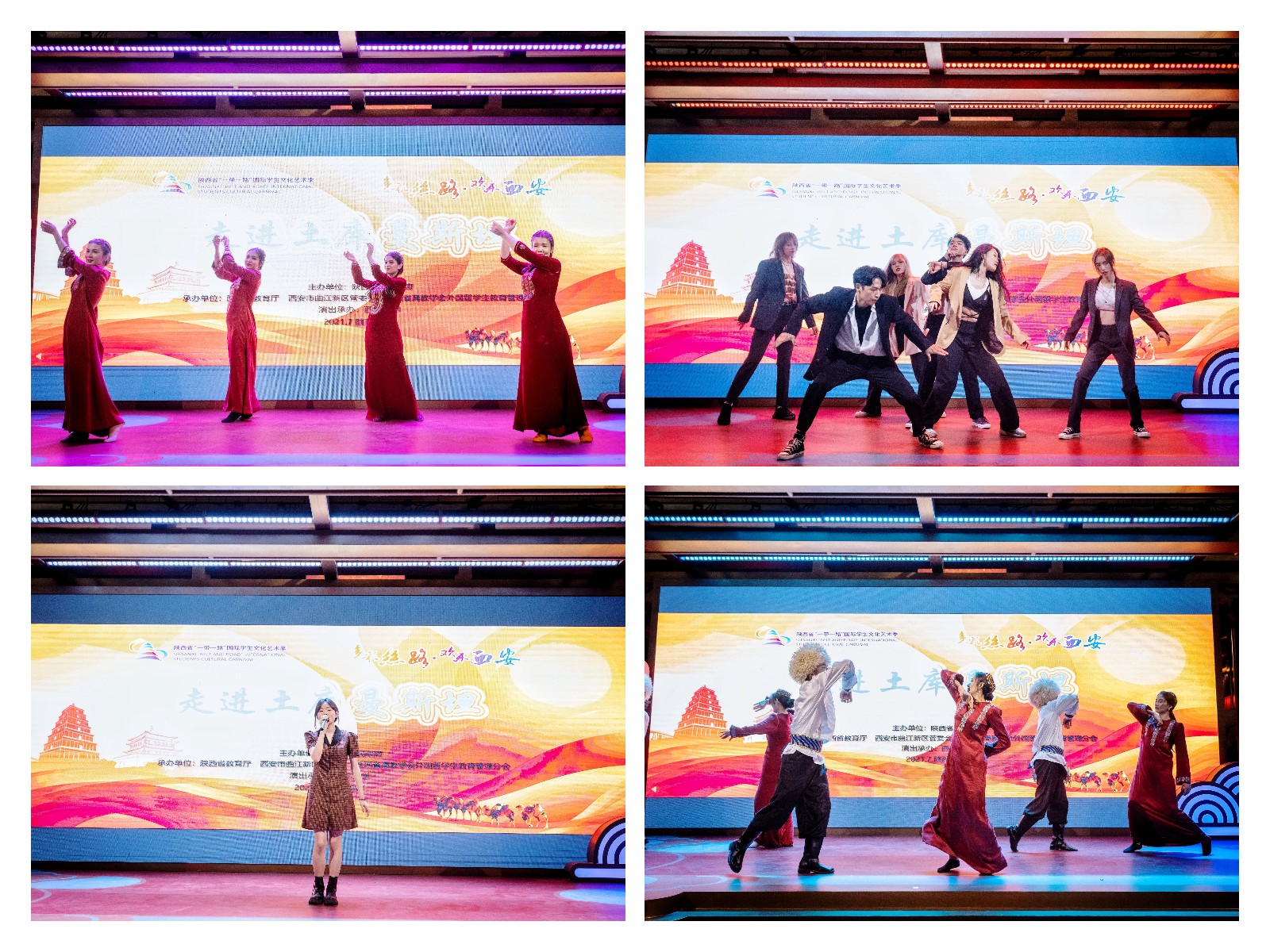 演出活动以极具活力的民族舞蹈《热情土库曼》拉开序幕。留学生身着土库曼斯坦传统服饰载歌载舞,用青春靓丽的身影展现了当代国际学生的良好风貌;中韩两国学生的潮流劲舞《LOVE SHOT》燃爆全场;吉尔吉斯斯坦乐器舞蹈《马背上的民族》让游客们更加了解丝路沿线上中亚国家的风土人情。中国学生一展歌喉,一曲《这世界那么多人》拉近了中国和世界人民心的距离。演出以土库曼舞蹈《相约里海边》结束。