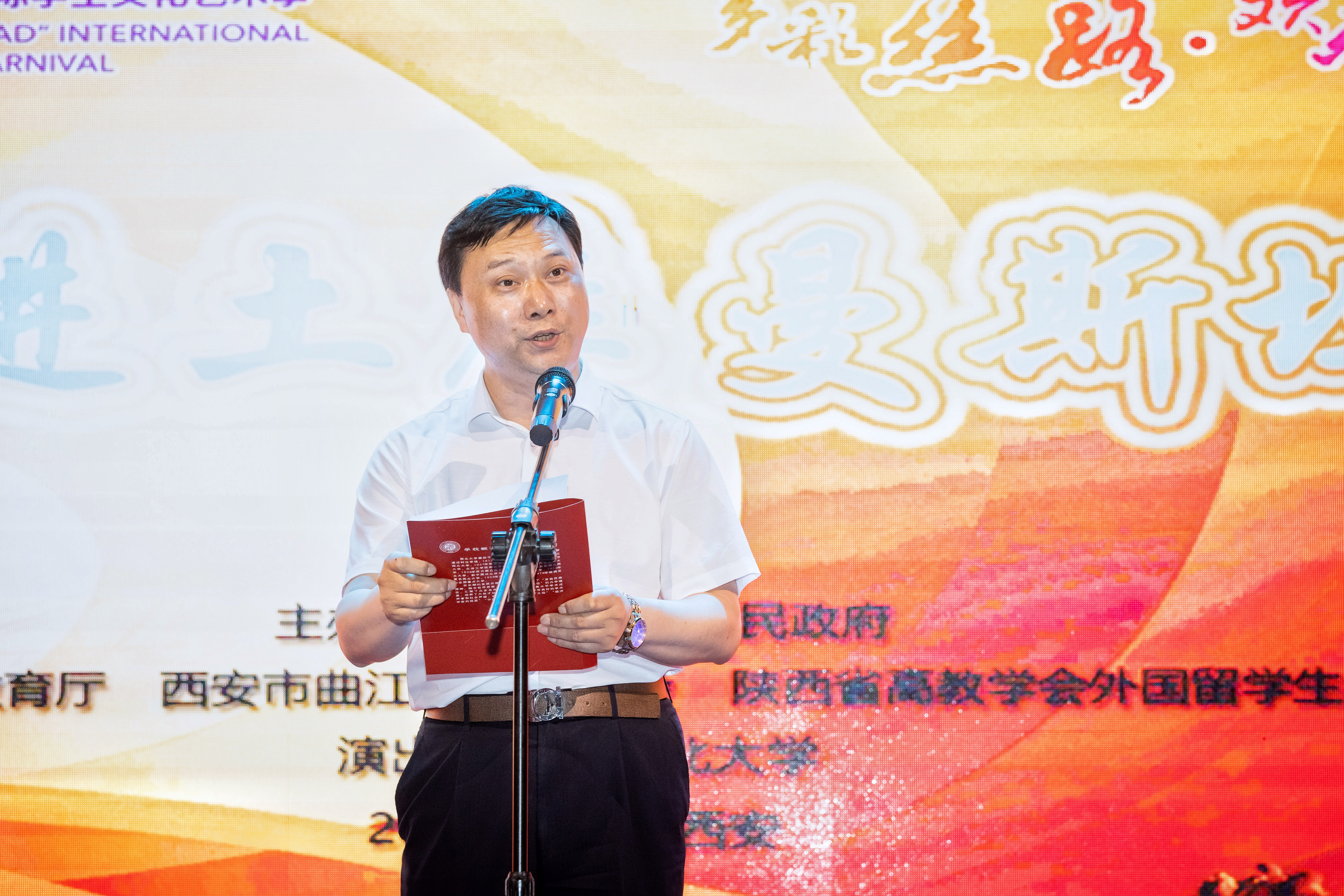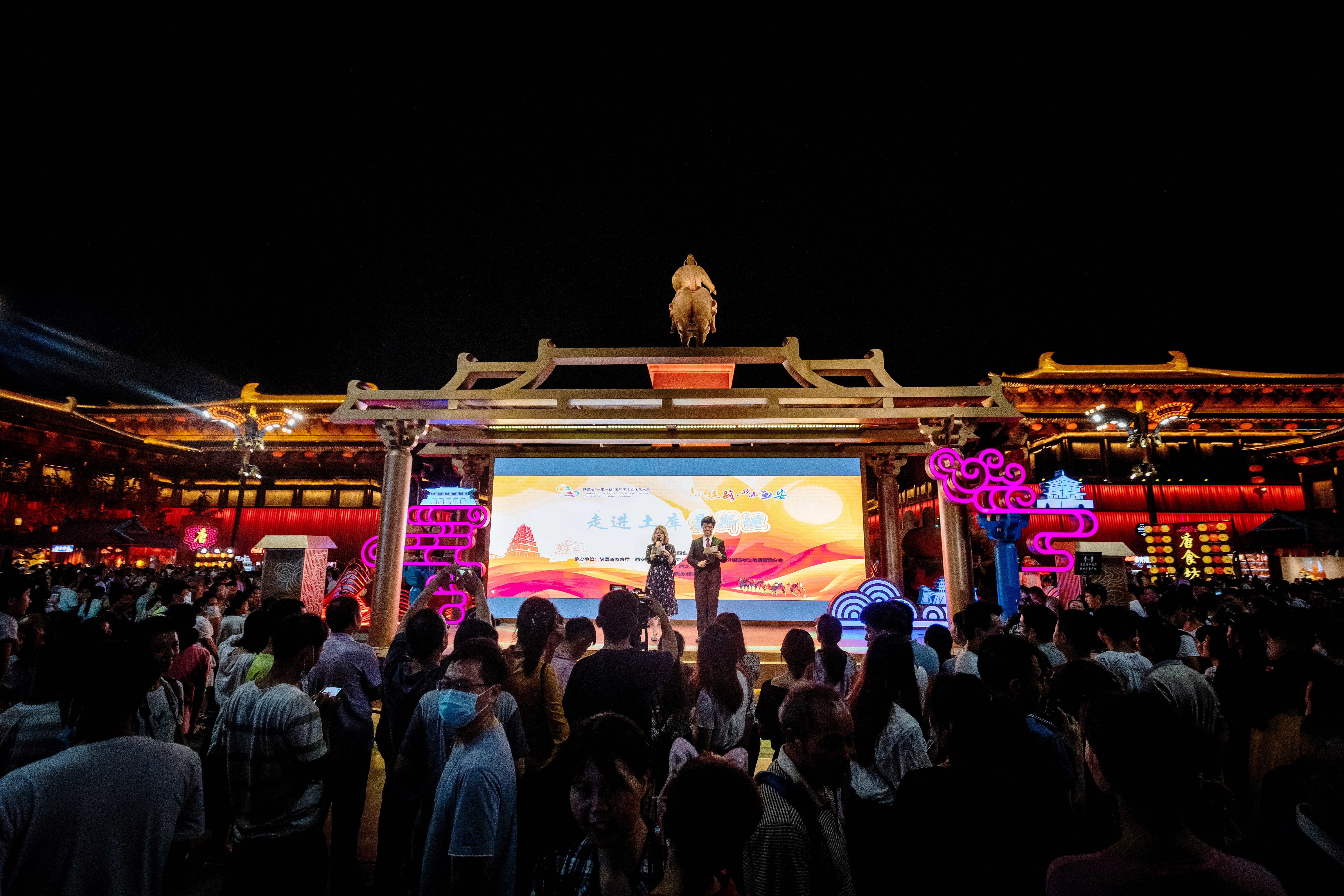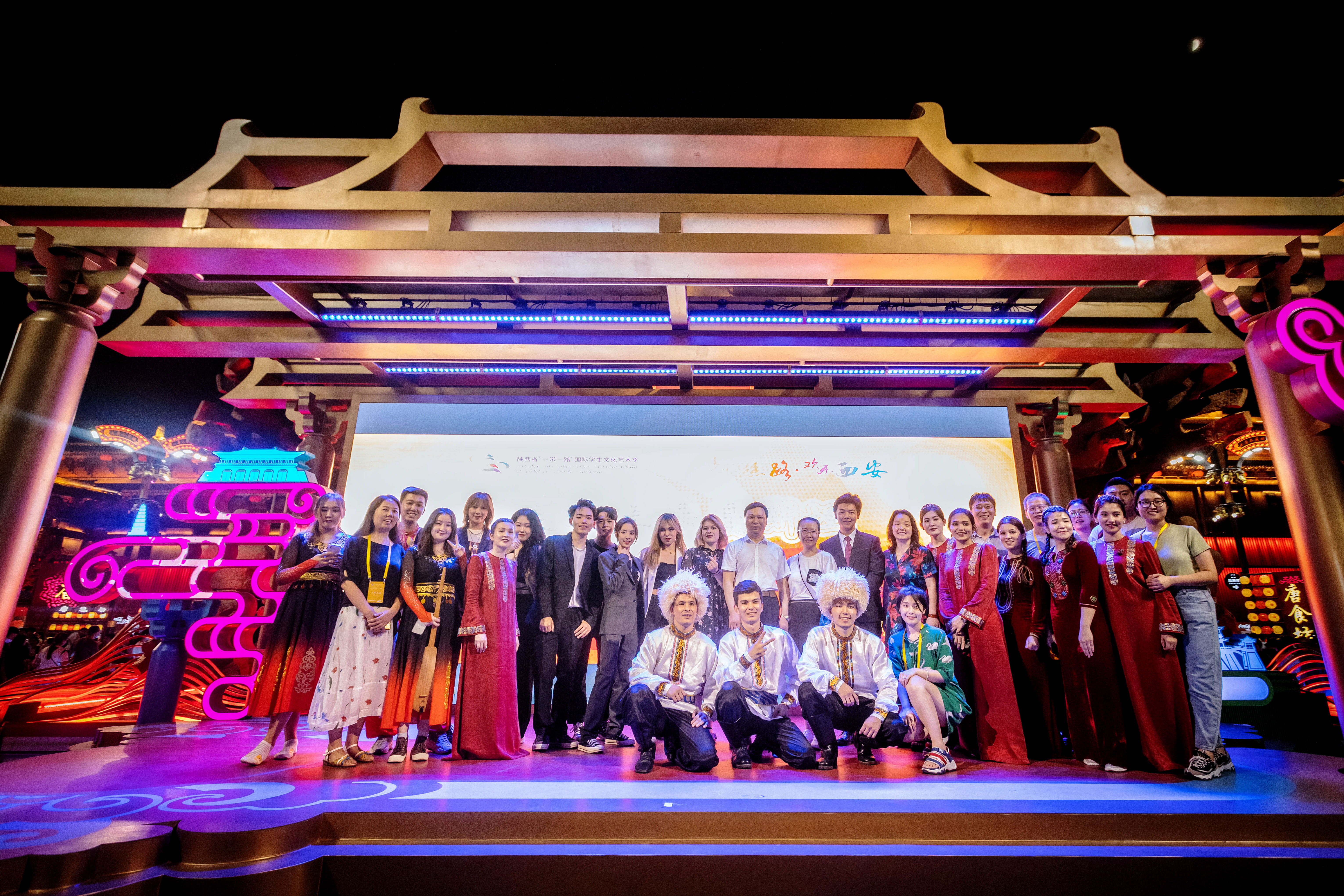 7月17日晚,陕西省“一带一路”国际学生文化艺术季第十场——“多彩丝路,欢乐西安--走进土库曼斯坦”主题展演在大唐不夜城步行街举办。本次国际学生文化艺术季由陕西省人民政府主办,陕西省教育厅、西安市曲江新区管委会、陕西省高教学会外国留学生教育管理分会承办,乐鱼web版登录入口具体负责本场演出。校党委常委、副校长赖绍聪,省教育厅对外合作与交流处(港澳台办公室)等相关负责人和现场游客共同欣赏表演。