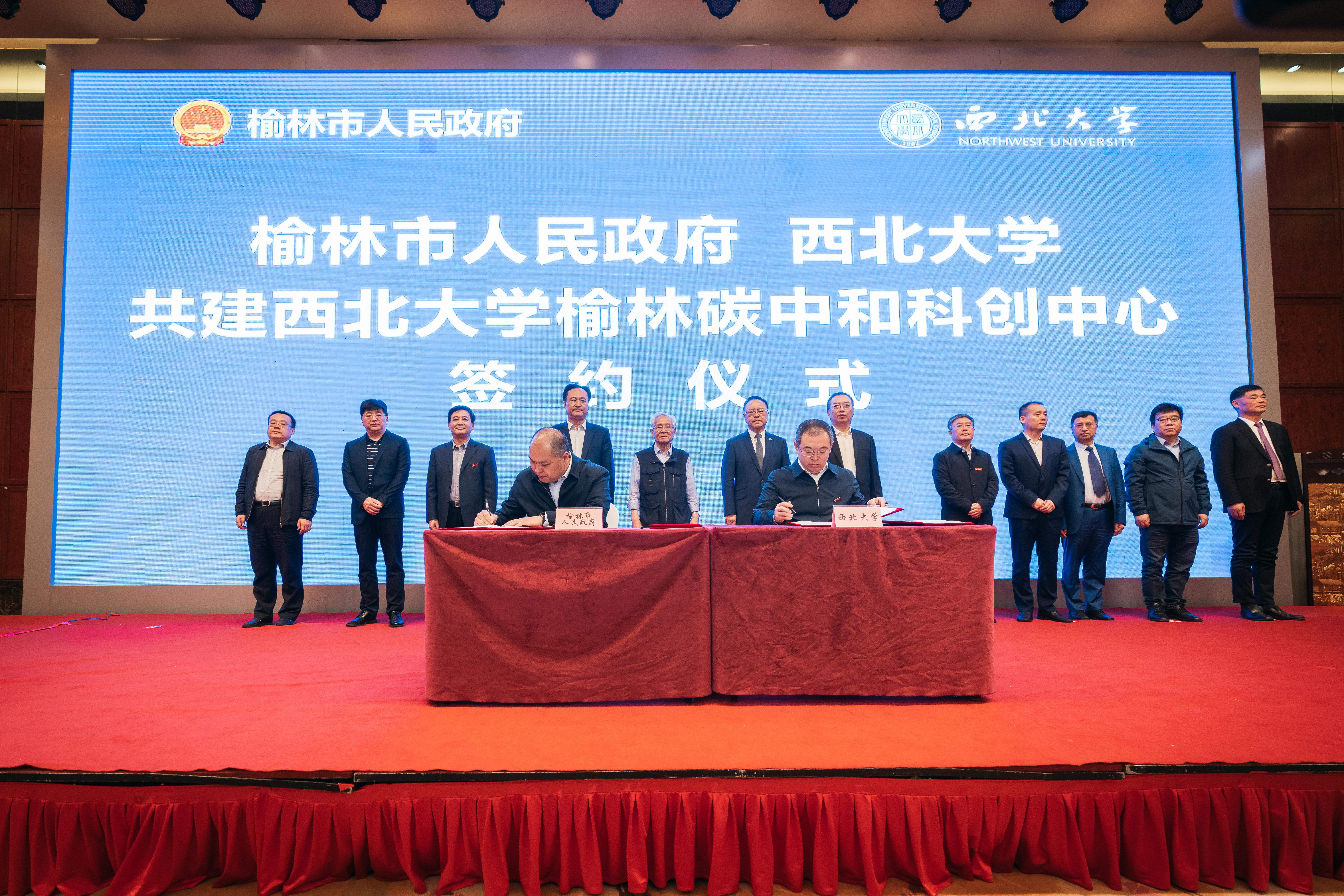 榆林市委常委、副市长李二中和校党委常委、副校长常江代表双方签署《榆林市人民政府 乐鱼web版登录入口共建乐鱼web版登录入口榆林碳中和科创中心合作协议》