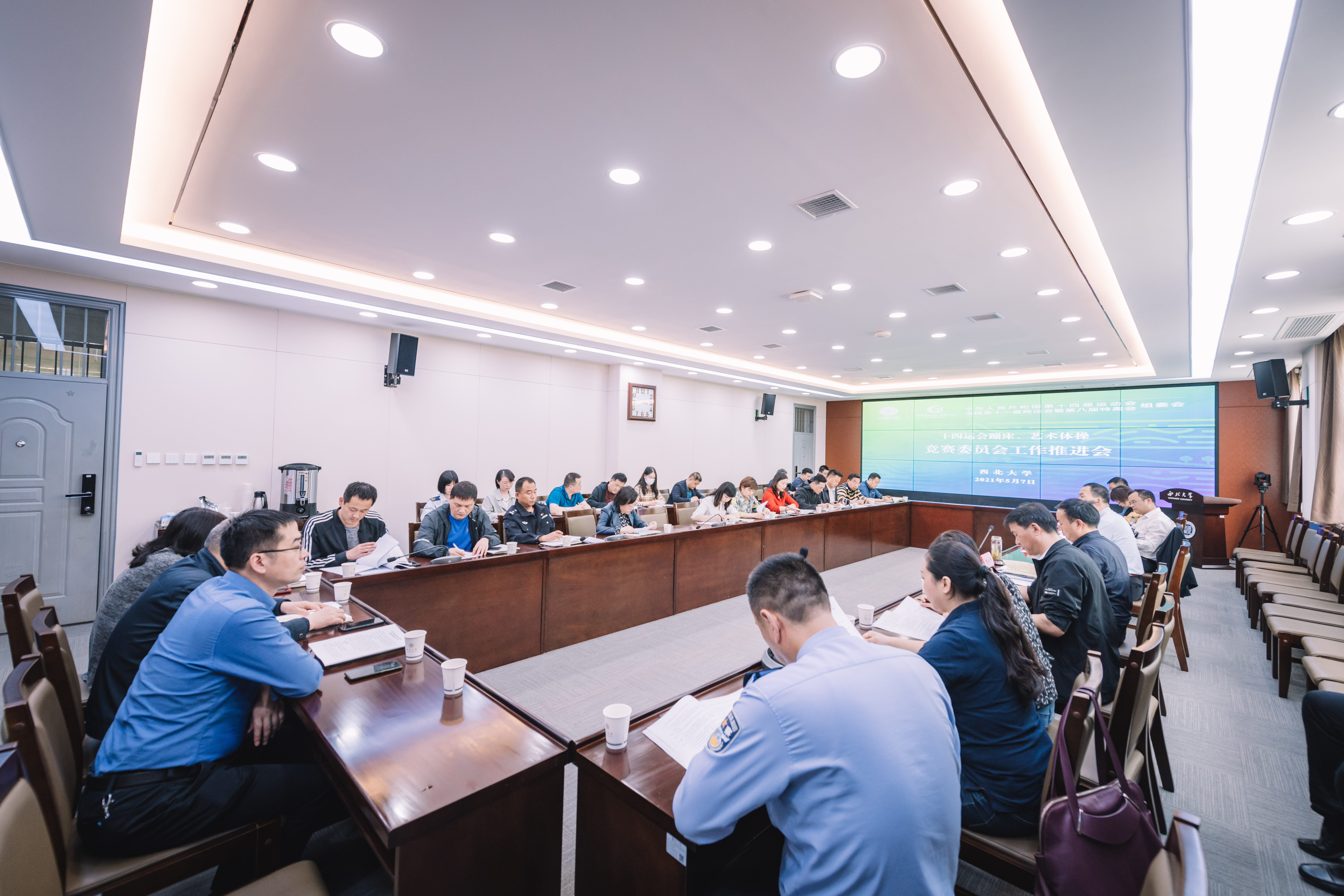 5月7日下午,学校在长安校区召开十四运会蹦床、艺术体操竞委会工作推进会。竞委会副主任、校党委副书记吕建荣,长安区执委会驻学校工作专班组长、长安区副区长杨永涛,十四运会组委会项目联络官吕梅,长安区相关职能部门负责人、驻学校工作专班成员以及学校竞委会各工作处负责人参加会议。会议由竞委会执行主任、校党委常委、副校长奚家米主持。