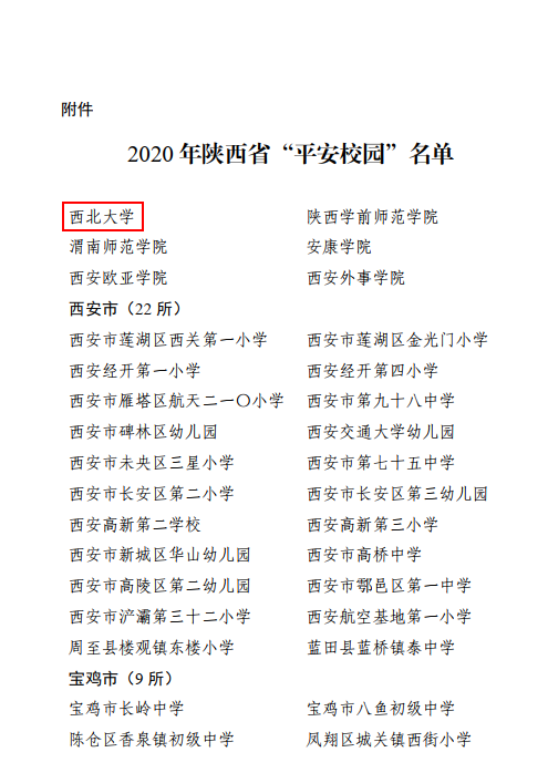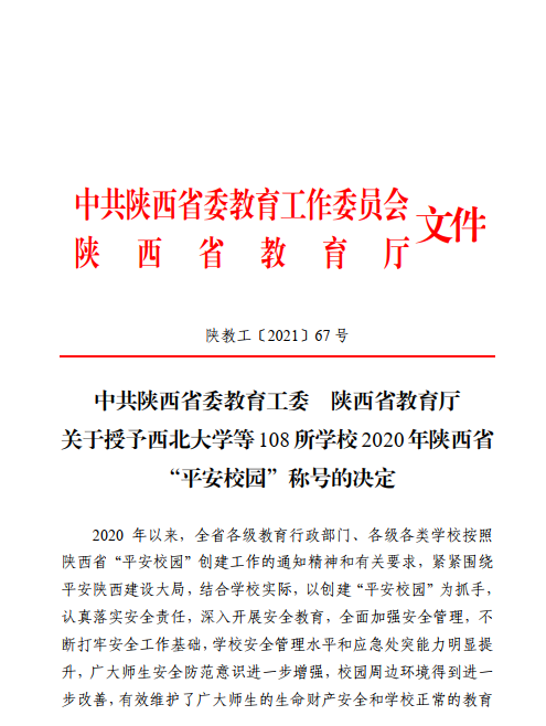 日前,陕西省教育工委、省教育厅发布了《关于授予乐鱼web版登录入口等108所学校2020年陕西省“平安校园”称号的决定》。