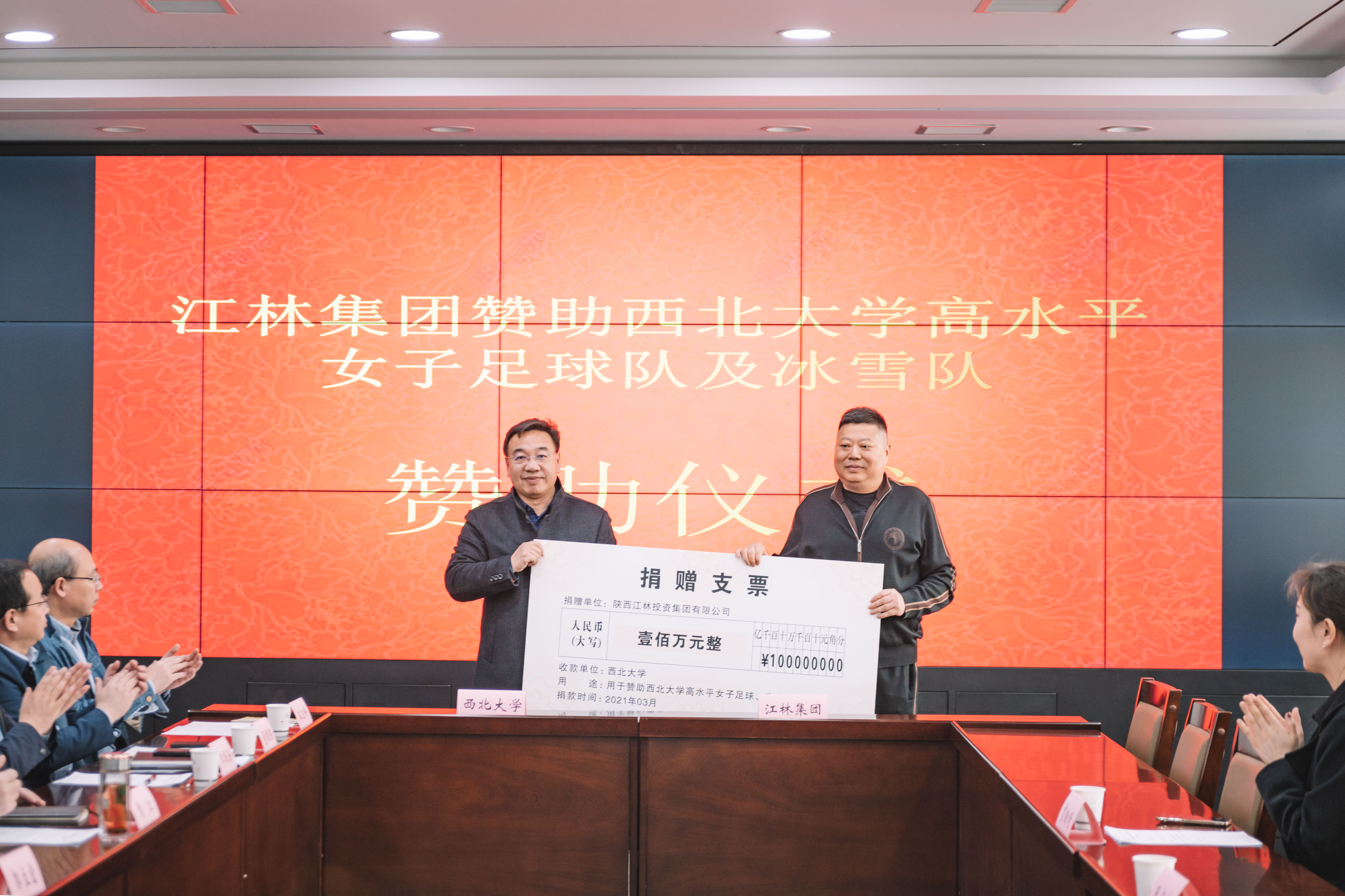 王占林代表江林集团向乐鱼web版登录入口高水平女子足球队及冰雪队捐赠人民币100万元
