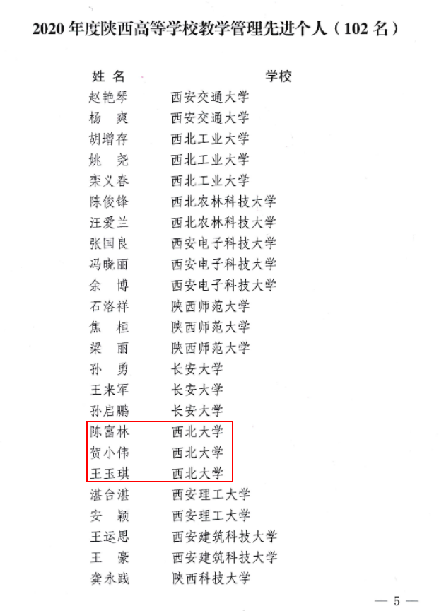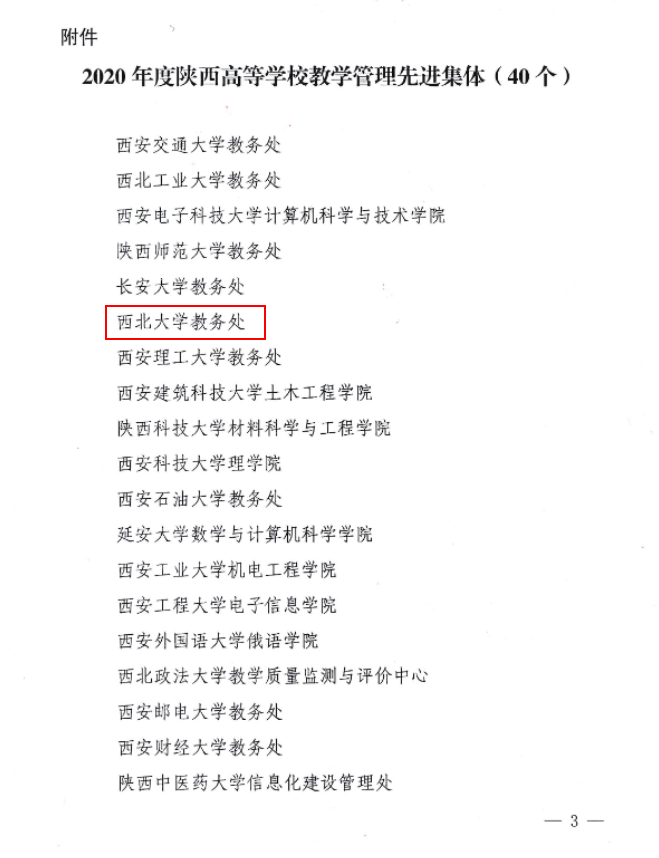 近日,陕西省教育厅印发《关于表彰2020年陕西高等学校教学管理工作先进集体和先进个人的通报》,乐鱼web版登录入口教务处荣获“陕西高等学校教学管理工作先进集体”,生命科学学院陈富林、信息化建设与管理处贺小伟、化工学院王玉琪等3人获评“陕西高等学校教学管理工作先进个人”。