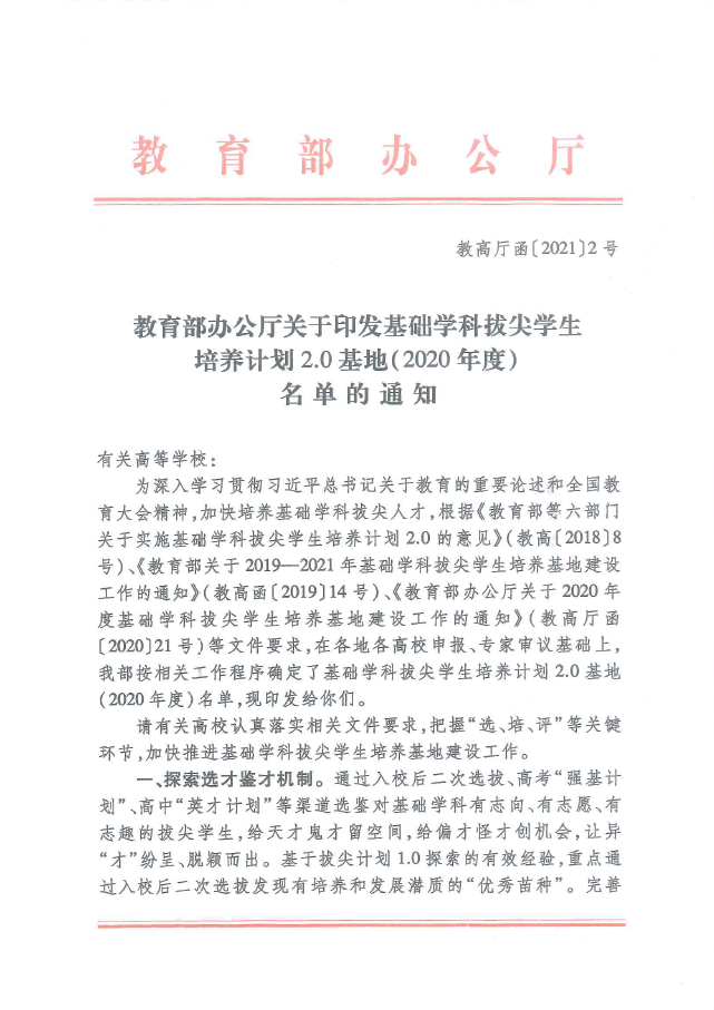2018年9月,教育部等六部门发布《关于实施基础学科拔尖学生培养计划2.0的意见》,将基础学科拔尖学生培养计划2.0作为教育部深化“六卓越一拔尖”计划改革进程,推进新工科、新医科、新农科、新文科建设,加快培养基础学科领域拔尖人才,构建高质量本科教育体系的关键环节和重要举措,以体制机制创新和教育教学改革为重点,逐步形成具有中国特色、世界水平的基础学科拔尖人才培养体系,着力培养一批勇攀科学高峰、推动科学文化发展的未来杰出自然科学家、社会科学家和医学科学家,进一步提升国家的硬实力、软实力和健康力,计划于2019-2021年遴选建立260个基础学科拔尖学生培养基地。
