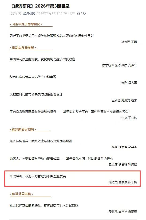 近日,乐鱼web版登录入口经济管理学院赵仁杰教授与霍宇辰博士等合作的论文《外需冲击、政府采购管理与小微企业发展》在顶级期刊《经济研究》2026年第3期发表,该文是赵仁杰教授主持的国家自然科学基金面上项目、陕西高校青年创新团队项目的阶段性成果。