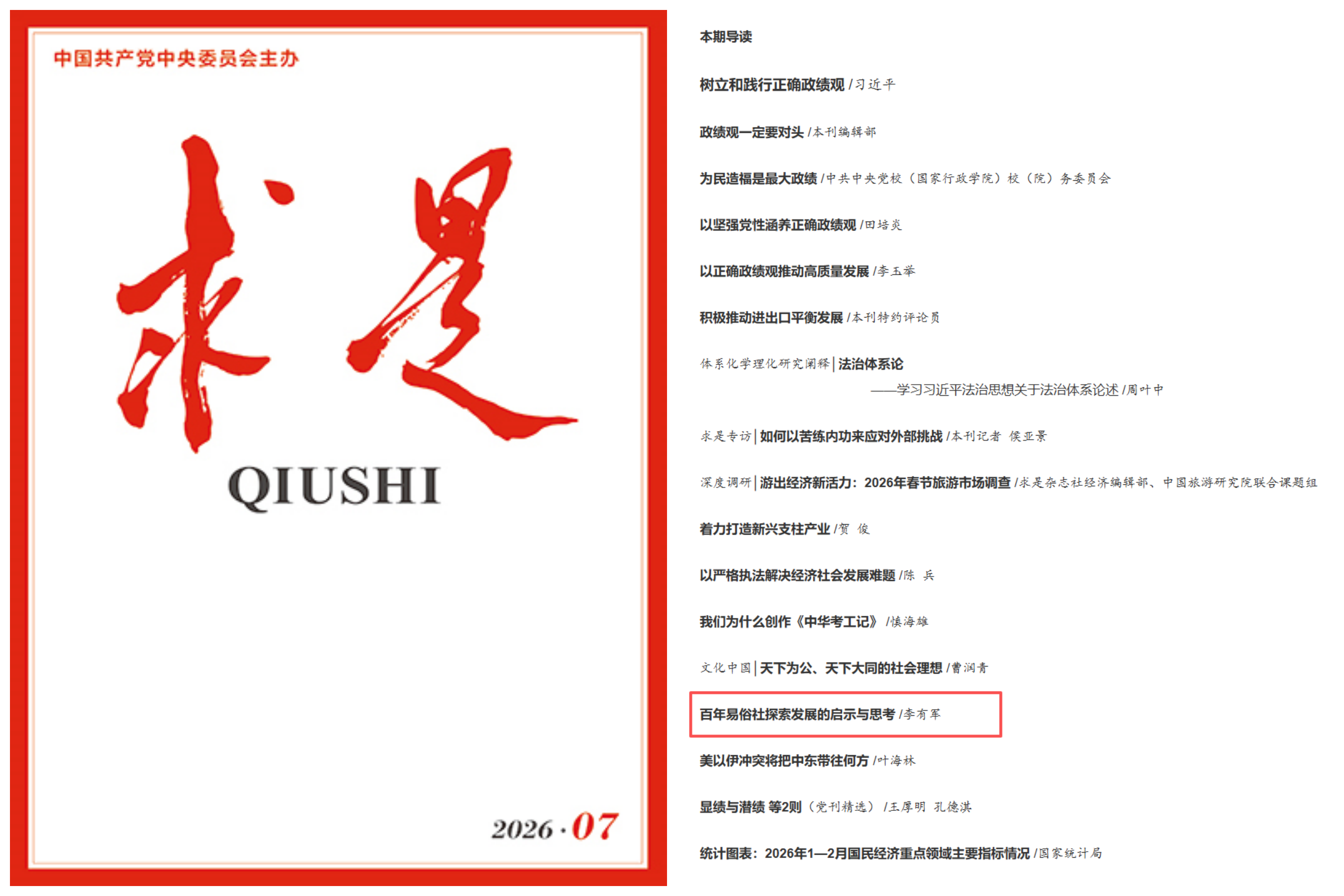 4月1日,《求是》杂志2026年第7期刊发了乐鱼web版登录入口文学院李有军教授论文《百年易俗社探索发展的启示与思考》。