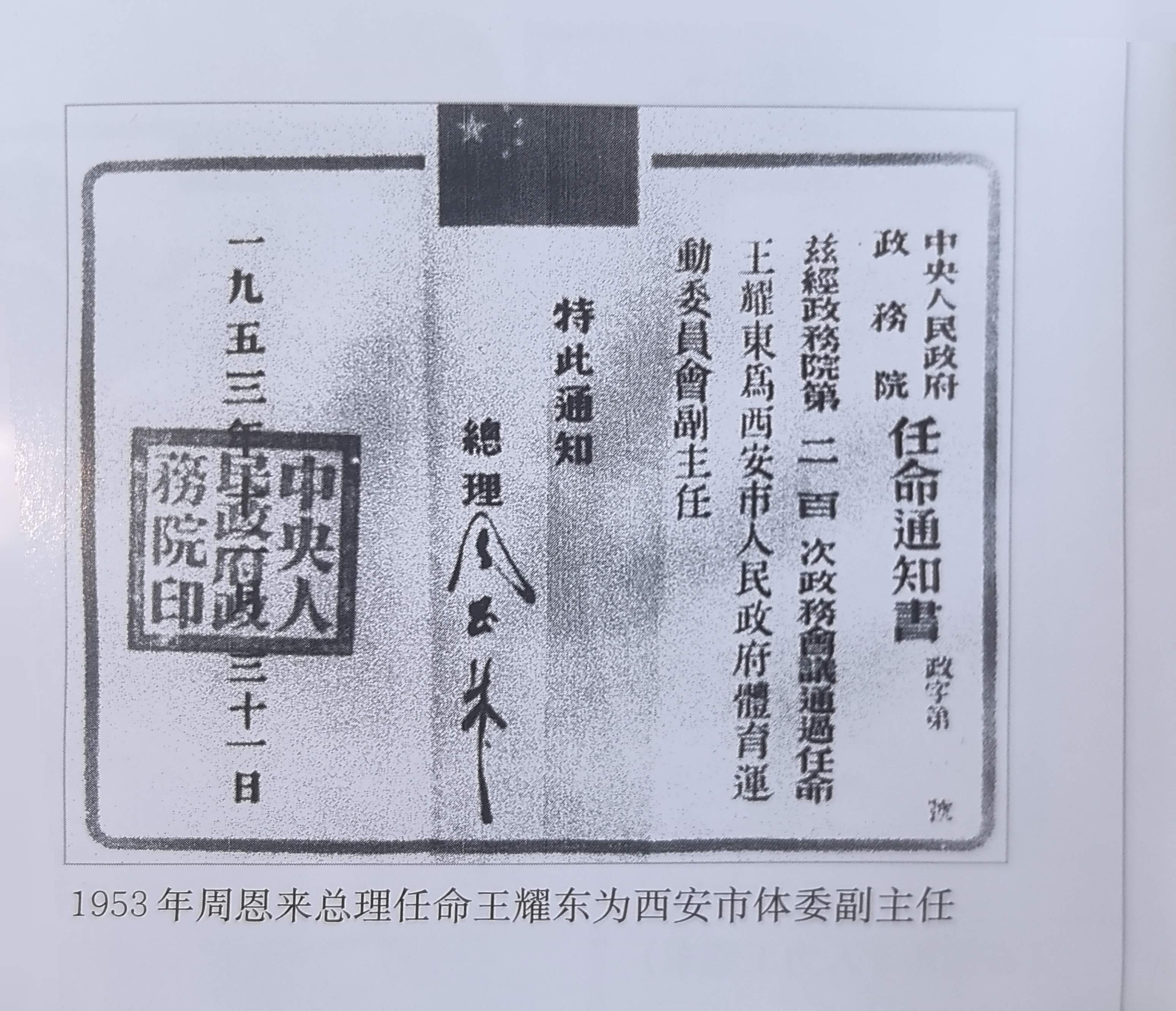 1952年,作为中华体总西北分会副主席,他再次赴京参加中华全国体育总会第二次代表大会,期间在中南海受到了毛主席的接见。特别是毛主席为大会所作的“发展体育运动 增强人民体质”的题词,让他进一步明确了新中国体育事业的指导方针,感受到了党和国家对体育事业的高度重视,同时他也深刻感受到国家对于体育事业的期待。1953年,政务院总理周恩来亲笔签发任命通知书,任命王耀东为西安市(当时是直辖市)体委副主任。参加建国初期的这一系列活动及被任命为西安市体委副主任,让王耀东在进入“知天命”的年龄段后,再度焕发了青春,开启了为“人民体育”事业而奋斗的第二个五十年的新周期。1979年王耀东年近八旬时又被选为中华全国体育总会的副主席,并连任两届达十年之久。