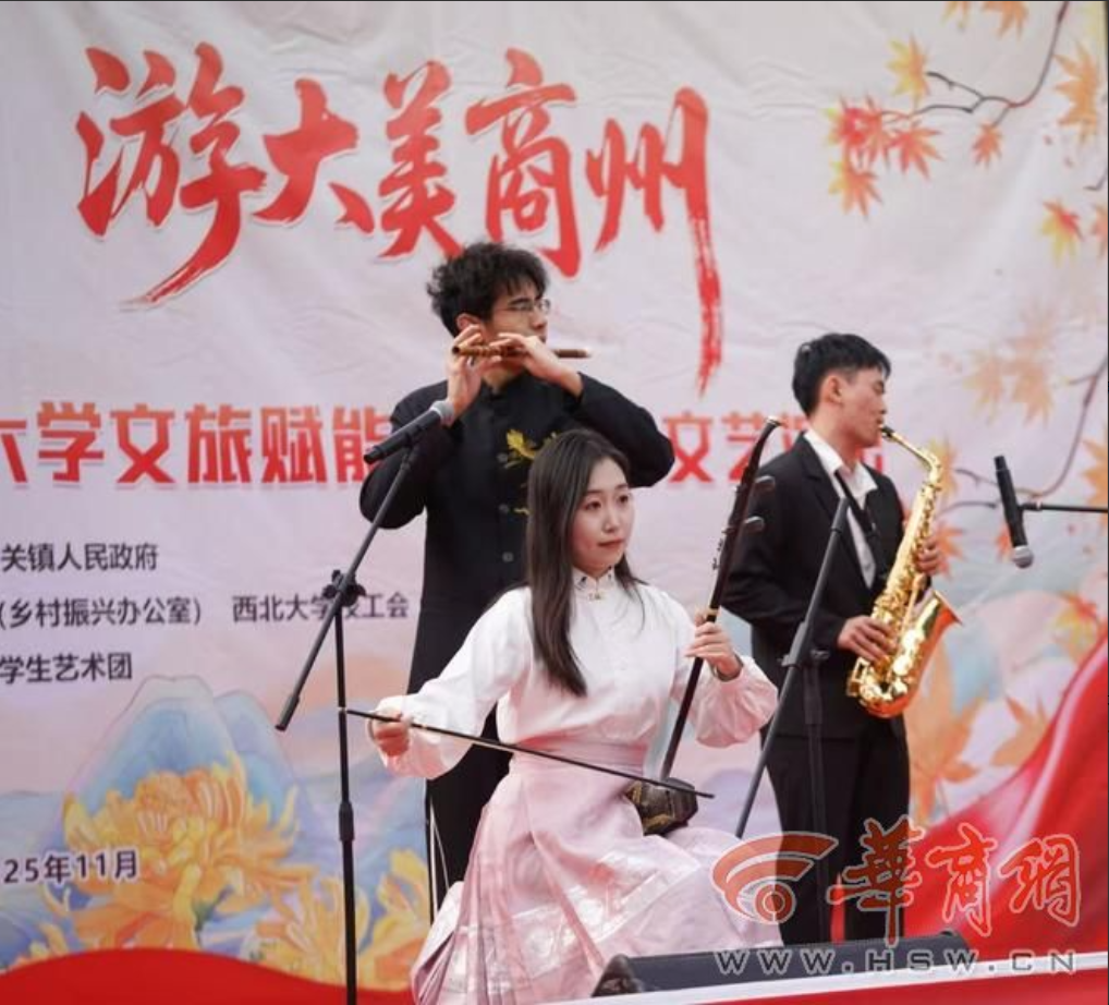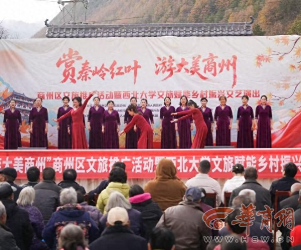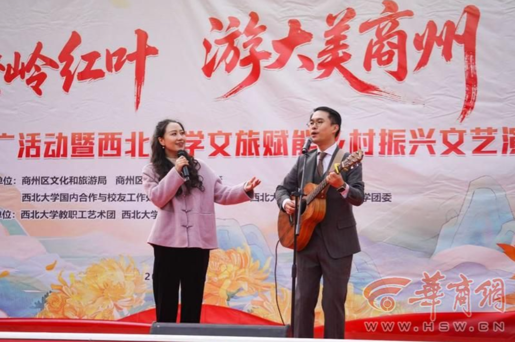 11月8日,“赏秦岭红叶、游大美商州”商州区文旅推广活动暨乐鱼web版登录入口文旅赋能乡村振兴文艺演出活动在陕西省商洛市商州区牧护关镇铁炉子村党群服务中心隆重举行。商州区政府党组成员曾佳、商州区文化和旅游局副局长李彦、商州区牧护关镇党委书记闵健、乐鱼web版登录入口国内合作与校友工作处(乡村振兴工作办公室)副处长燕来出席活动,商州区牧护关镇、乐鱼web版登录入口工会、乐鱼web版登录入口团委相关工作负责人,以及铁炉子村“两委”干部、镇包村干部、乐鱼web版登录入口驻村工作队全体成员、铁炉子村村民和游客等500 余人观看演出。演出节目由乐鱼web版登录入口工会教职工艺术团、乐鱼web版登录入口团委学生艺术团精心编排。