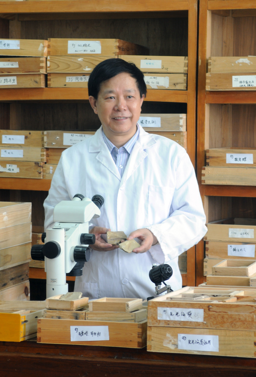 舒德干在鉴定化石。受访者供图