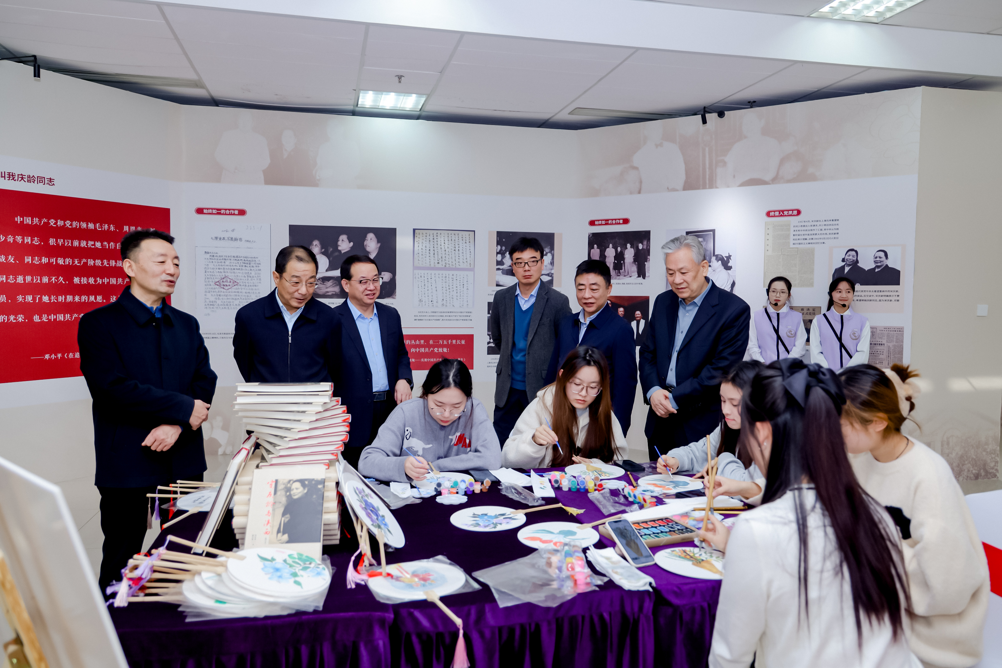 随后,与会嘉宾一同参观展览,展览由乐鱼web版登录入口学生志愿讲解员全程讲解。开幕式现场,乐鱼web版登录入口艺术学院学生进行了以宋庆龄绘画作品为主题的团扇绘画活动。