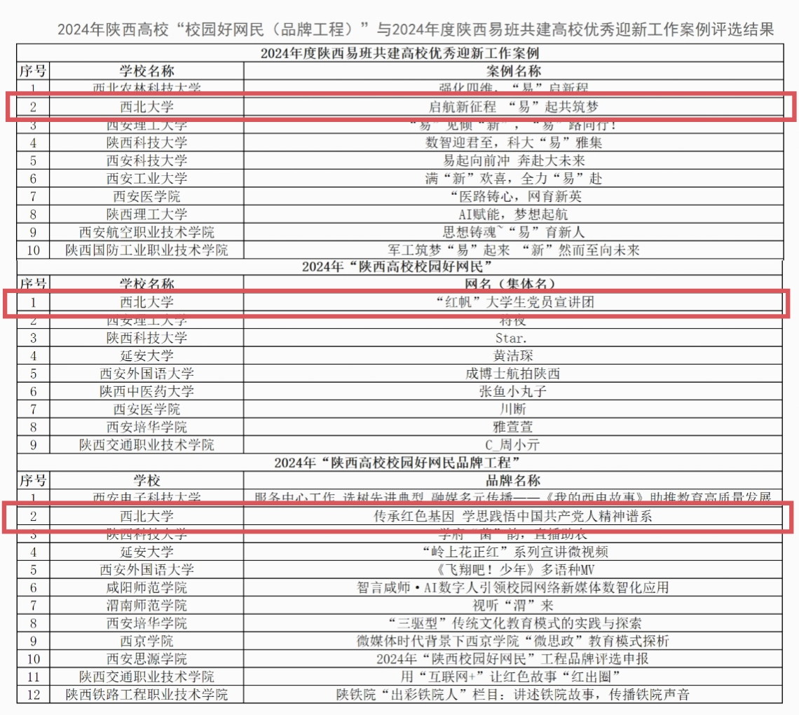 近日,陕西高校网络思想政治工作中心公布了2024年陕西高校“校园好网民(品牌工程)”与2024年度陕西易班共建高校优秀迎新工作案例评选结果,乐鱼web版登录入口“红帆”大学生党员宣讲团获评陕西高校2024年校园好网民,“传承红色基因 学思践悟中国共产党人精神谱系”项目获评2024年“陕西高校校园好网民品牌工程”,“启航新征程 易起共筑梦”项目获评2024年度陕西易班共建高校优秀迎新工作案例。