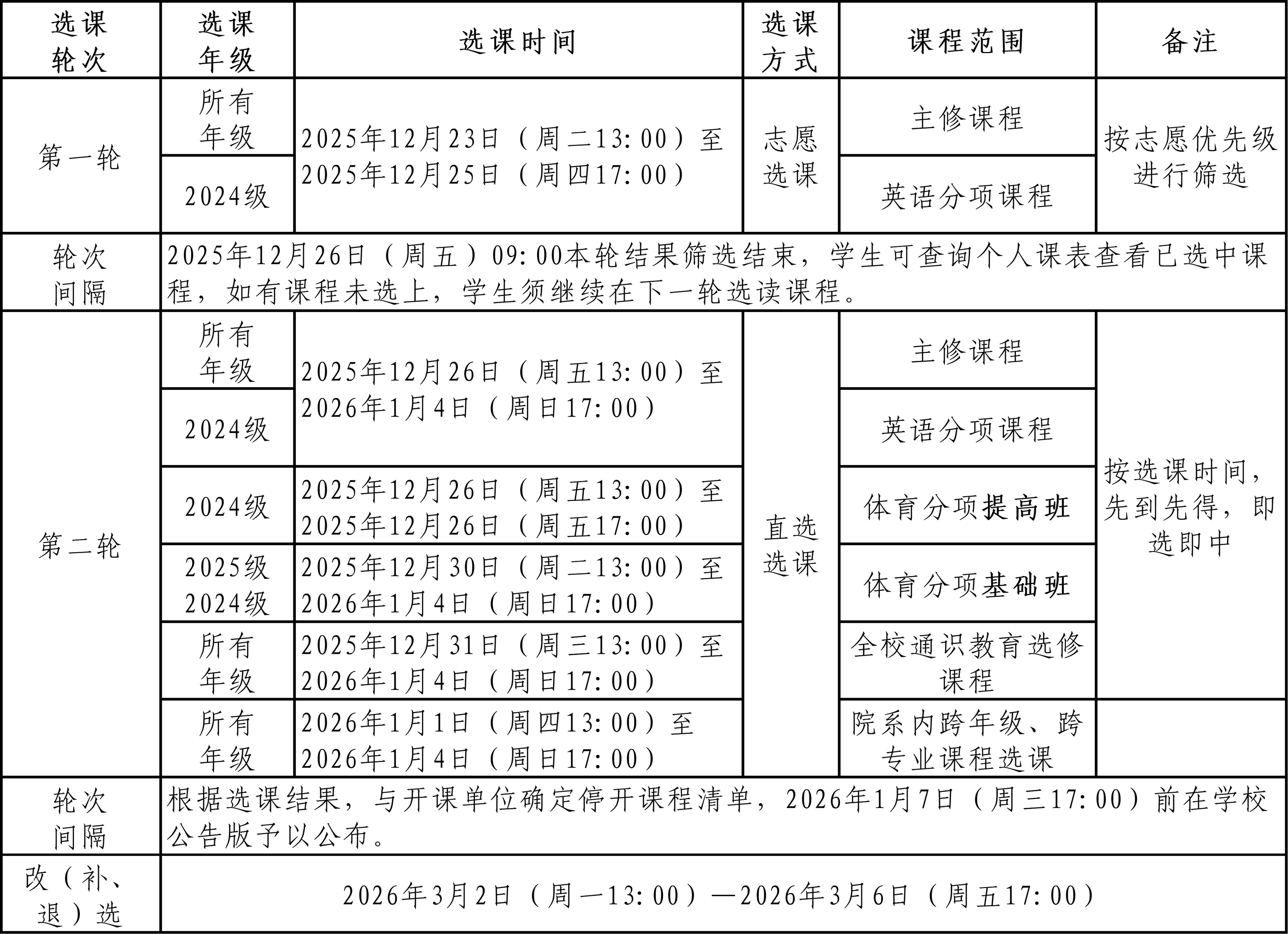 统一选课时间:2025年12月23日13:00至2026年1月4日17:00