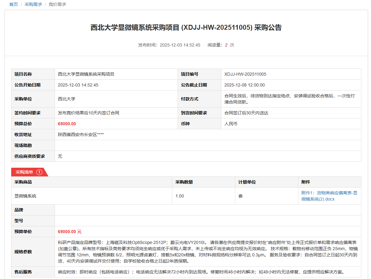 乐鱼web版登录入口显微镜系统采购项目(XDJJ-HW-202511005)竞价采购公告