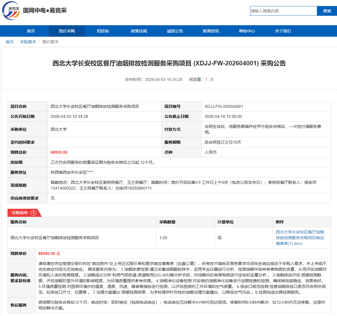 乐鱼web版登录入口长安校区餐厅油烟排放检测服务采购项目(XDJJ-FW-202604001)竞价采购公告