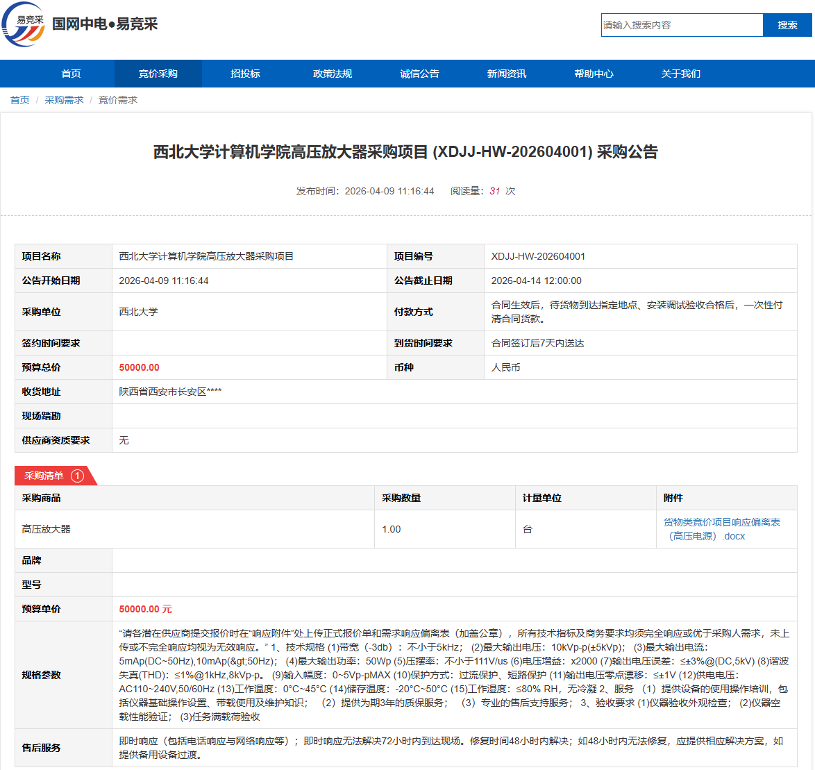 乐鱼web版登录入口计算机学院高压放大器采购项目(XDJJ-HW-202604001)竞价采购公告