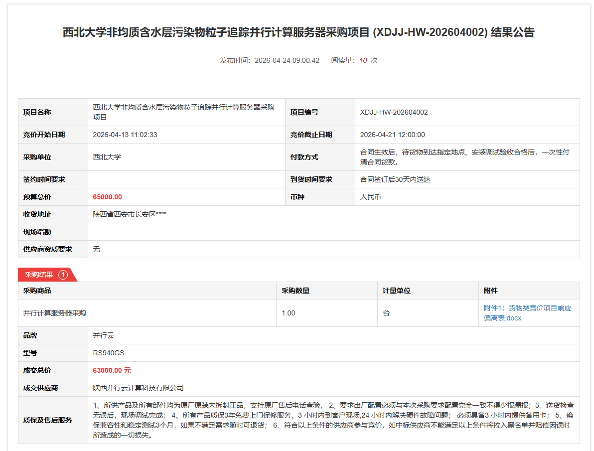 乐鱼web版登录入口非均质含水层污染物粒子追踪并行计算服务器采购项目(XDJJ-HW-202604002)竞价结果公告