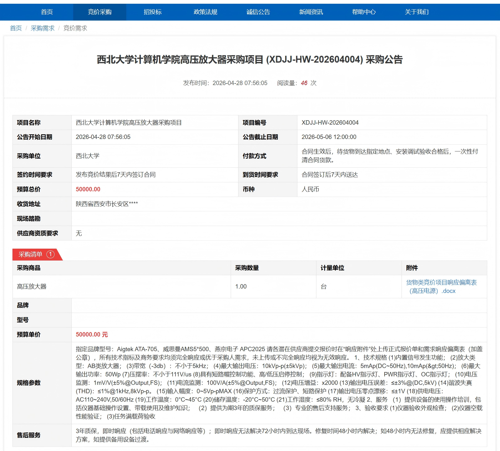 乐鱼web版登录入口计算机学院高压放大器采购项目(XDJJ-HW-202604004)竞价采购公告
