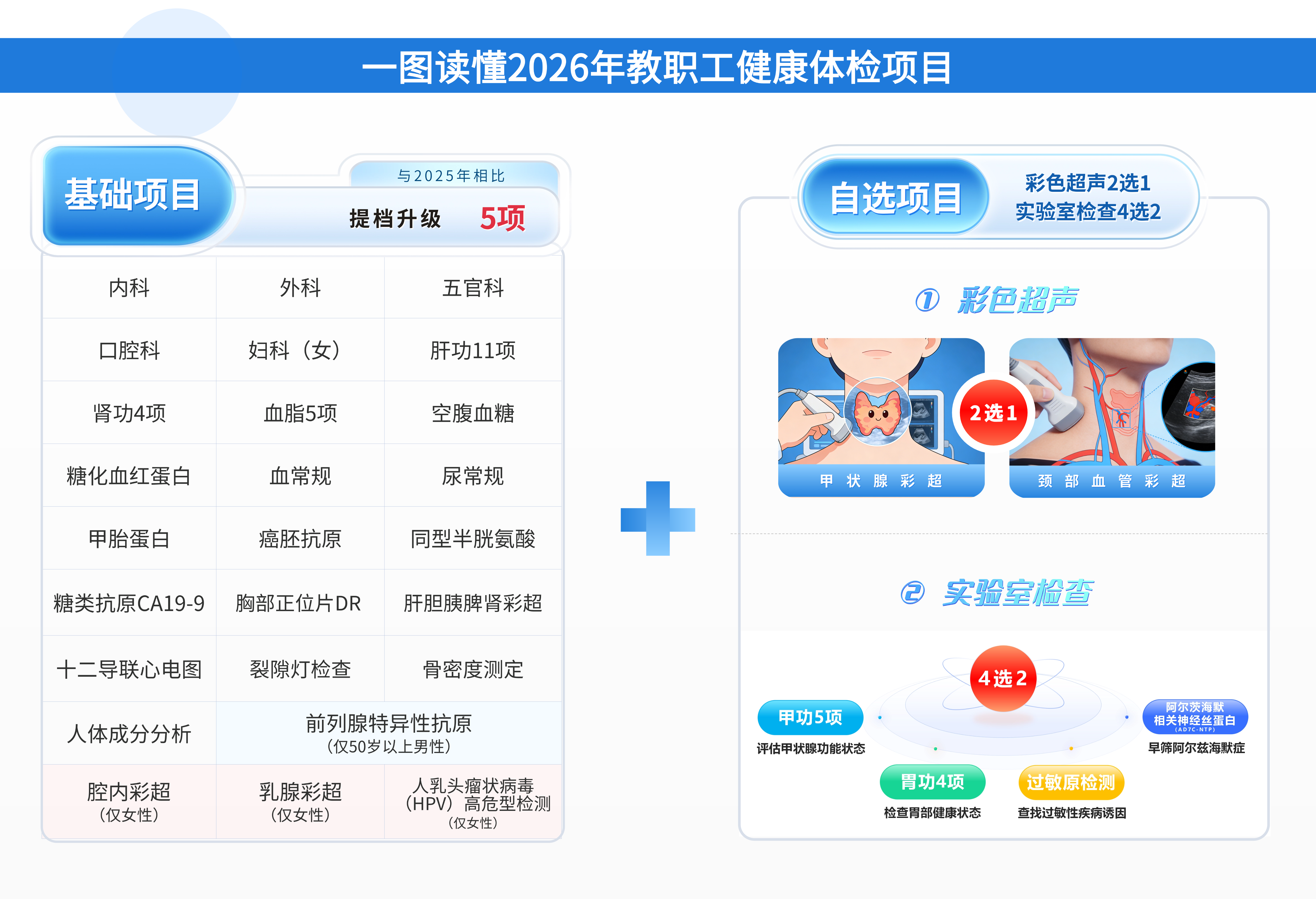 为更大限度满足教职工体检个性化需求,本年度教职工体检持续深化“1+2X”精准化体检模式,全面优化项目组合。除基础项目外,参检教职工可根据自身需求,在“彩色超声”两项自选项目中任选一项进行检查,在“实验室检查”四类自选项目中任选两类进行检查。