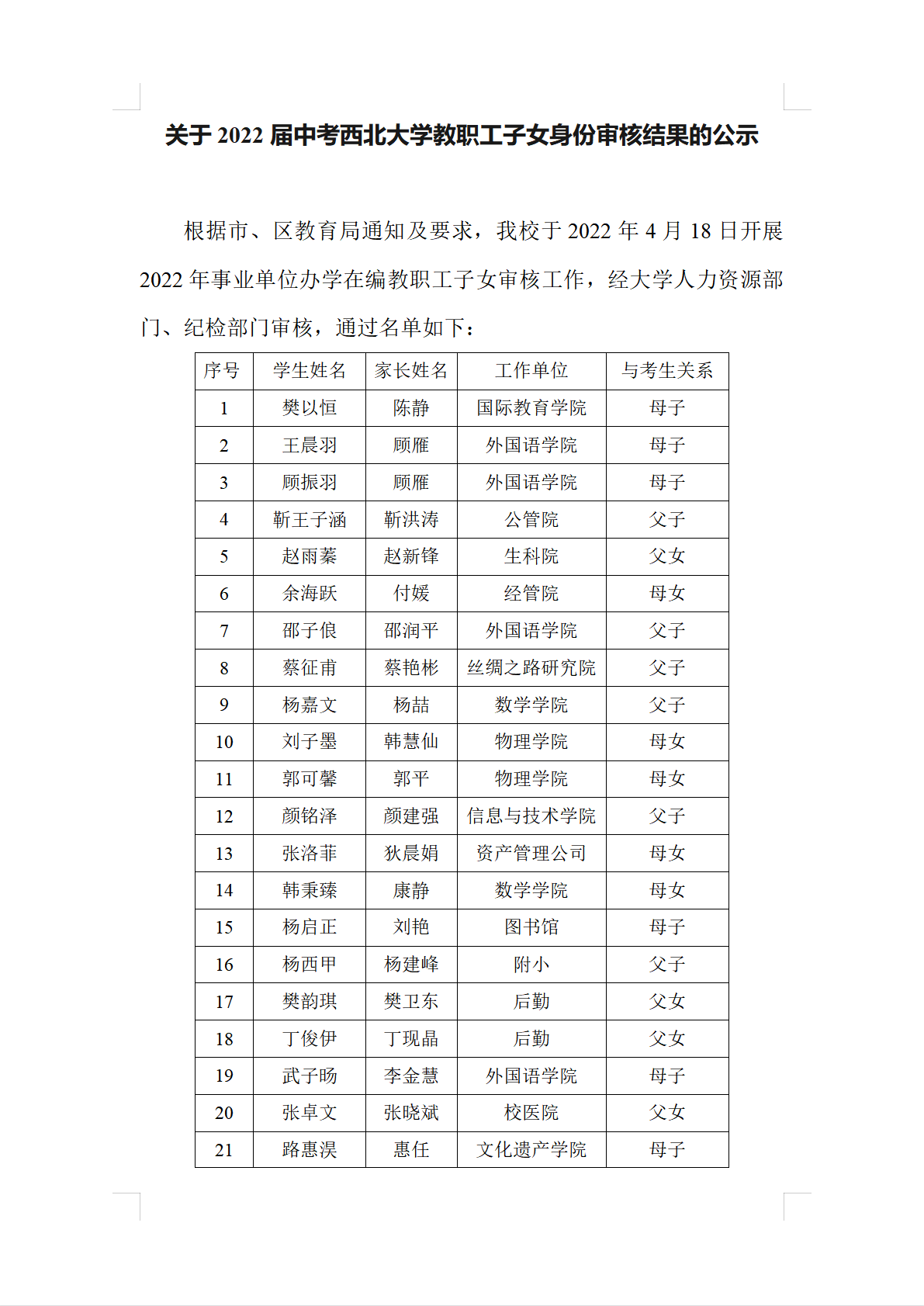关于2022届中考乐鱼web版登录入口教职工子女身份审核结果的公示
