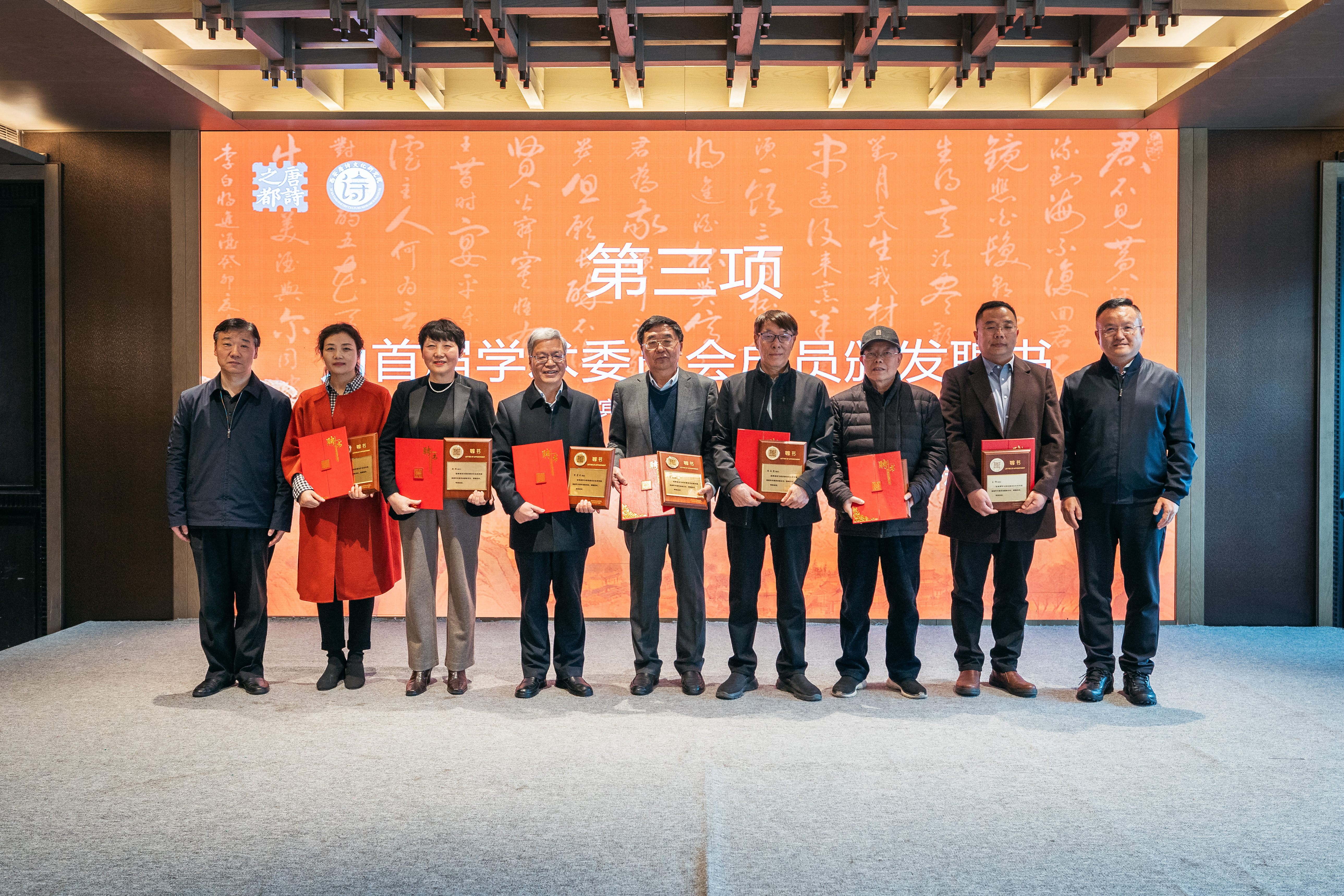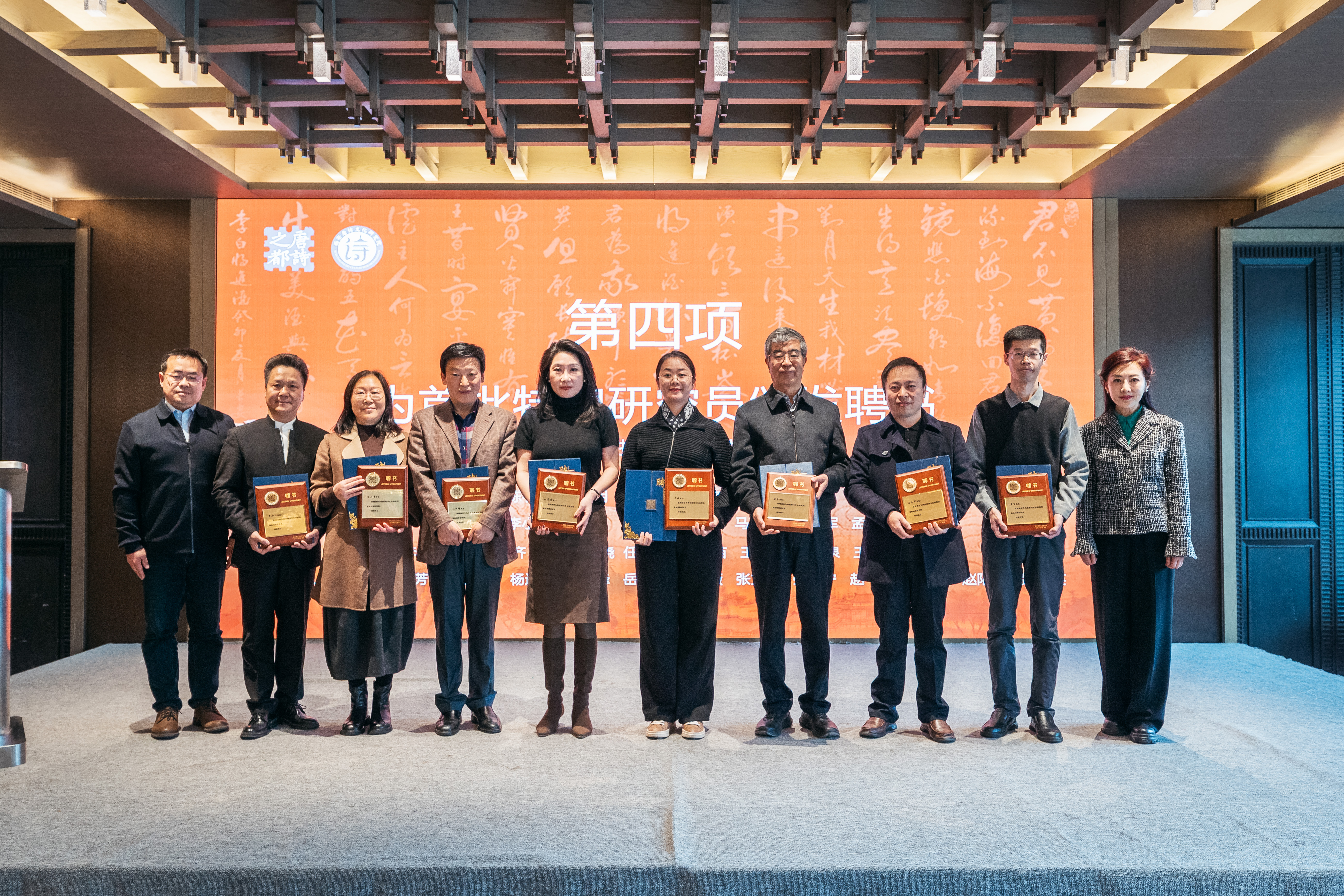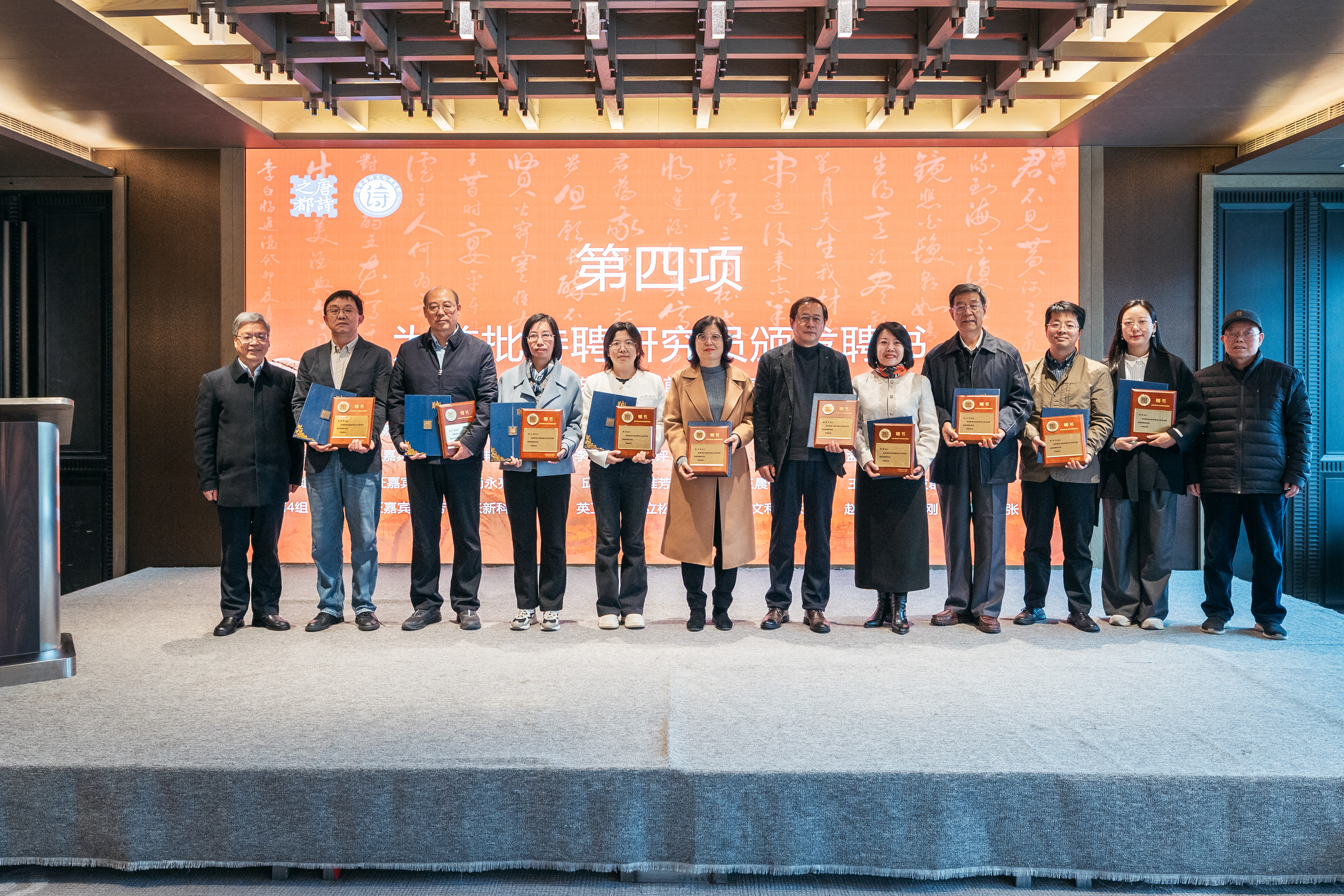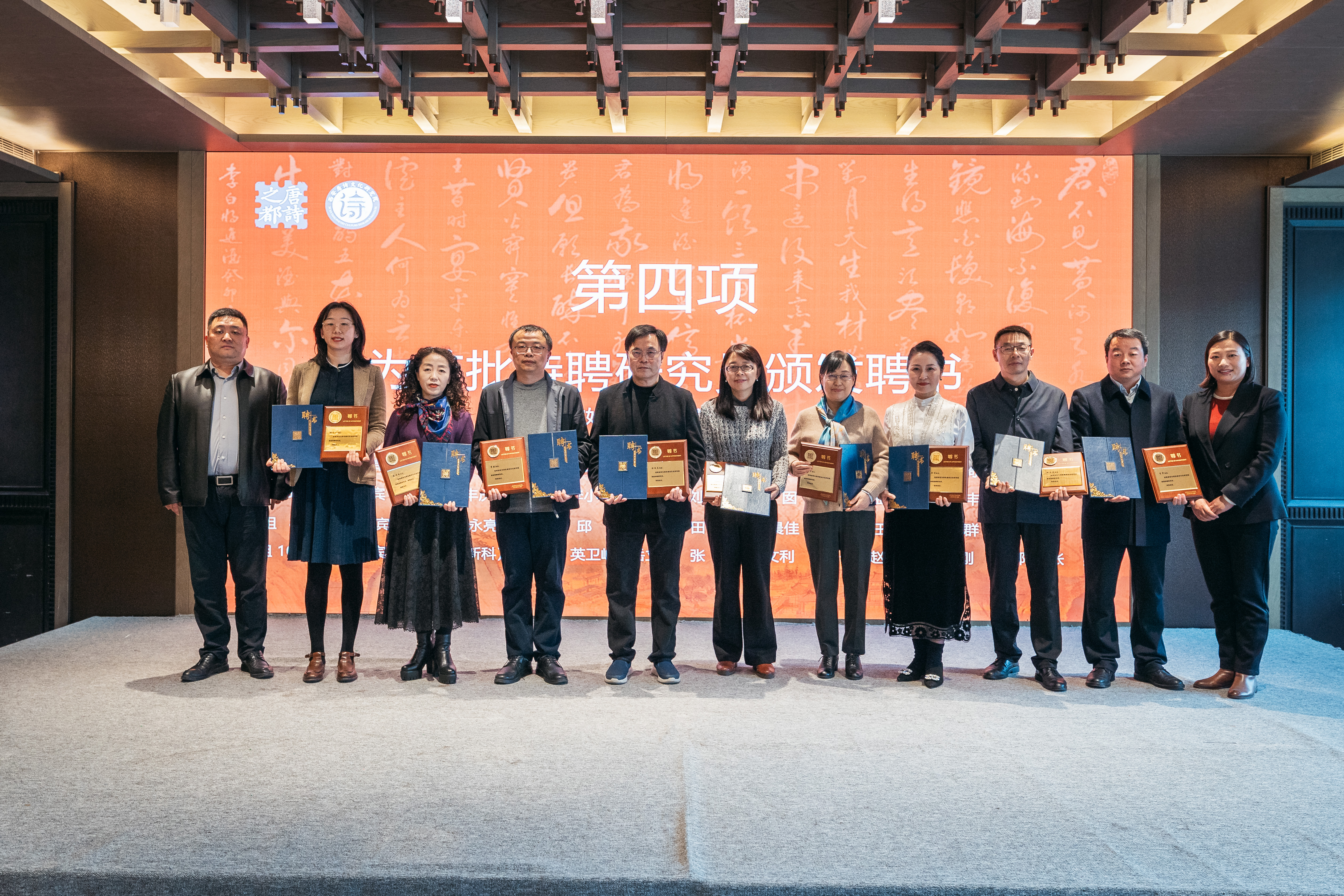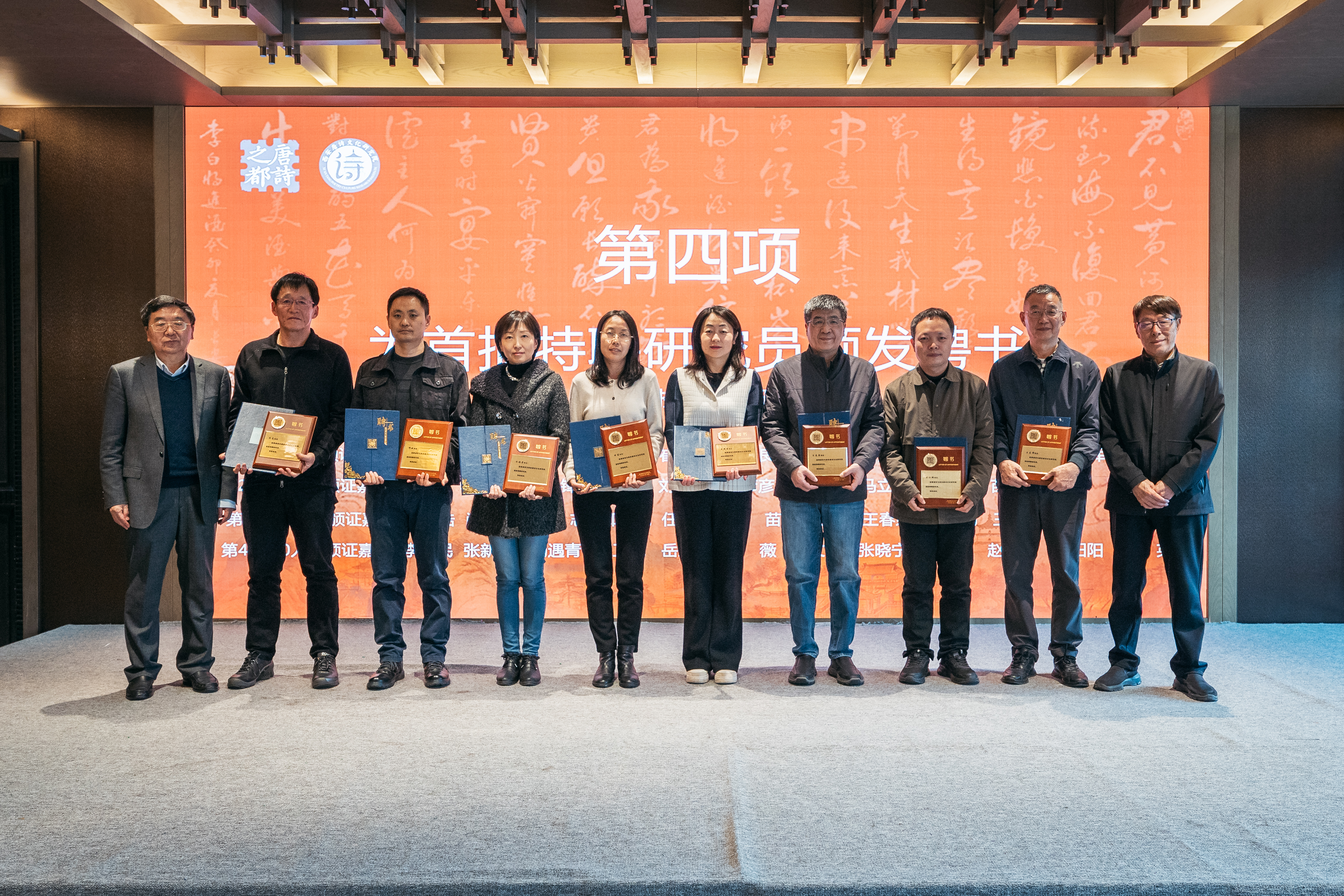 仪式上,王辉、蒋林为首届学术委员会人员尚永亮、李浩、李芳民、王伟、赵杭、王早娟、张新科颁发聘书,并与颁证嘉宾为36位首批特聘研究员颁发聘书。