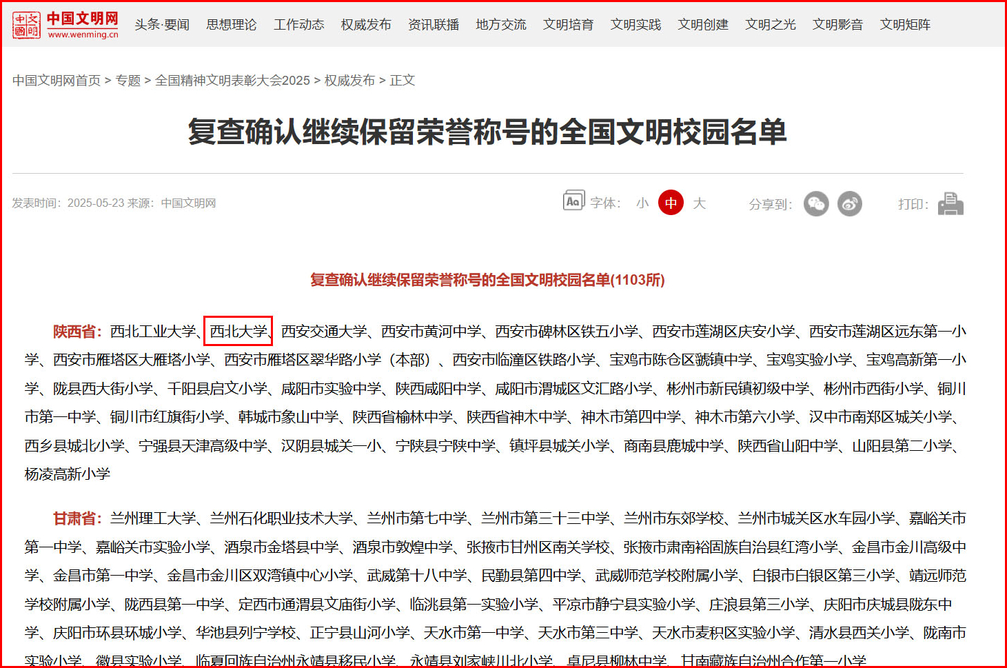 五年来,学校深耕120余年办学史文化沃土,打造大学精神文化建设工作体系、活动体系、环境体系,“公诚勤朴”校训、“艰苦创业 自强不息”西大精神和“传承创新”“扎根西北”等精神特质深入人心。系统总结推广30年逐级创建文明校园的经验成效,诚信奠基、文化引领、全员参与、全方位提升,全力推动精神文明建设向更高水平迈进,全国文明校园“金字招牌”的强大效能不断凸显。2025年5月23日,全国精神文明建设表彰大会在北京召开,会上宣读了中央宣传思想文化工作领导小组表彰决定,乐鱼web版登录入口顺利通过了全国文明校园复查评估。